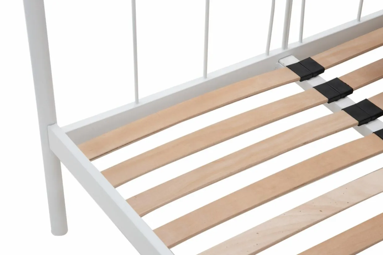 Łóżko sprawia wrażenie lekkiej konstrukcji, która nie przytłoczy niewielkiego pokoju, zwłaszcza, że wykonano je w białym kolorze.