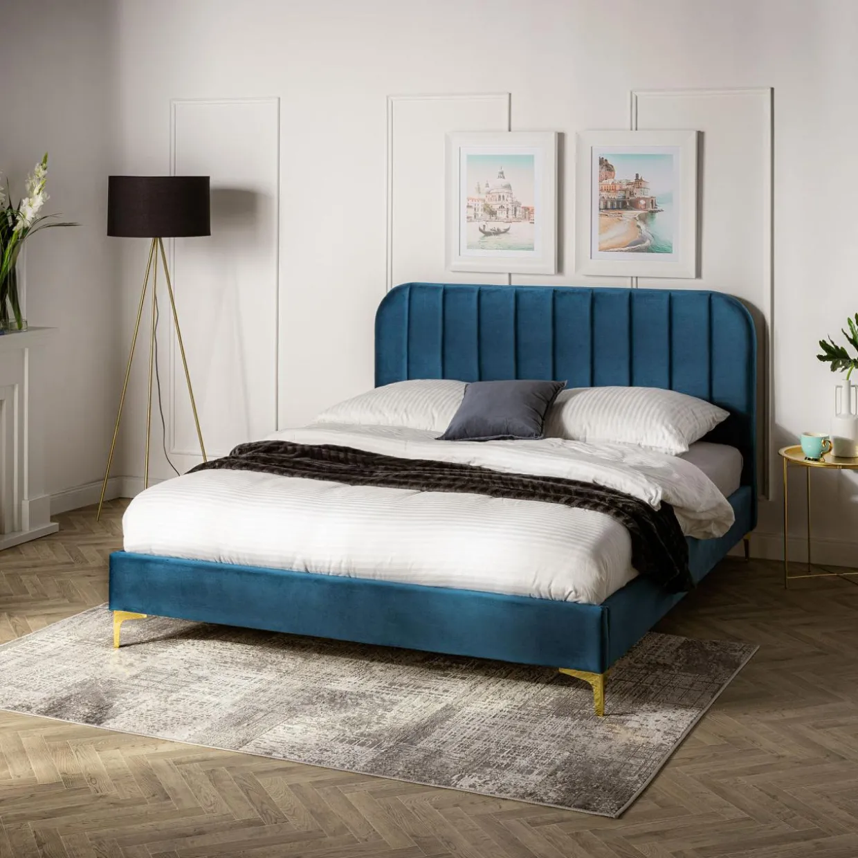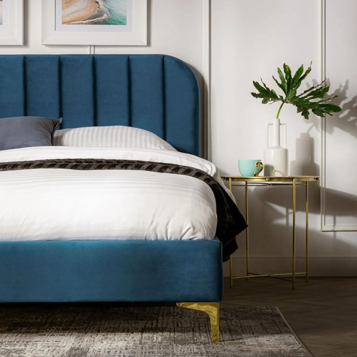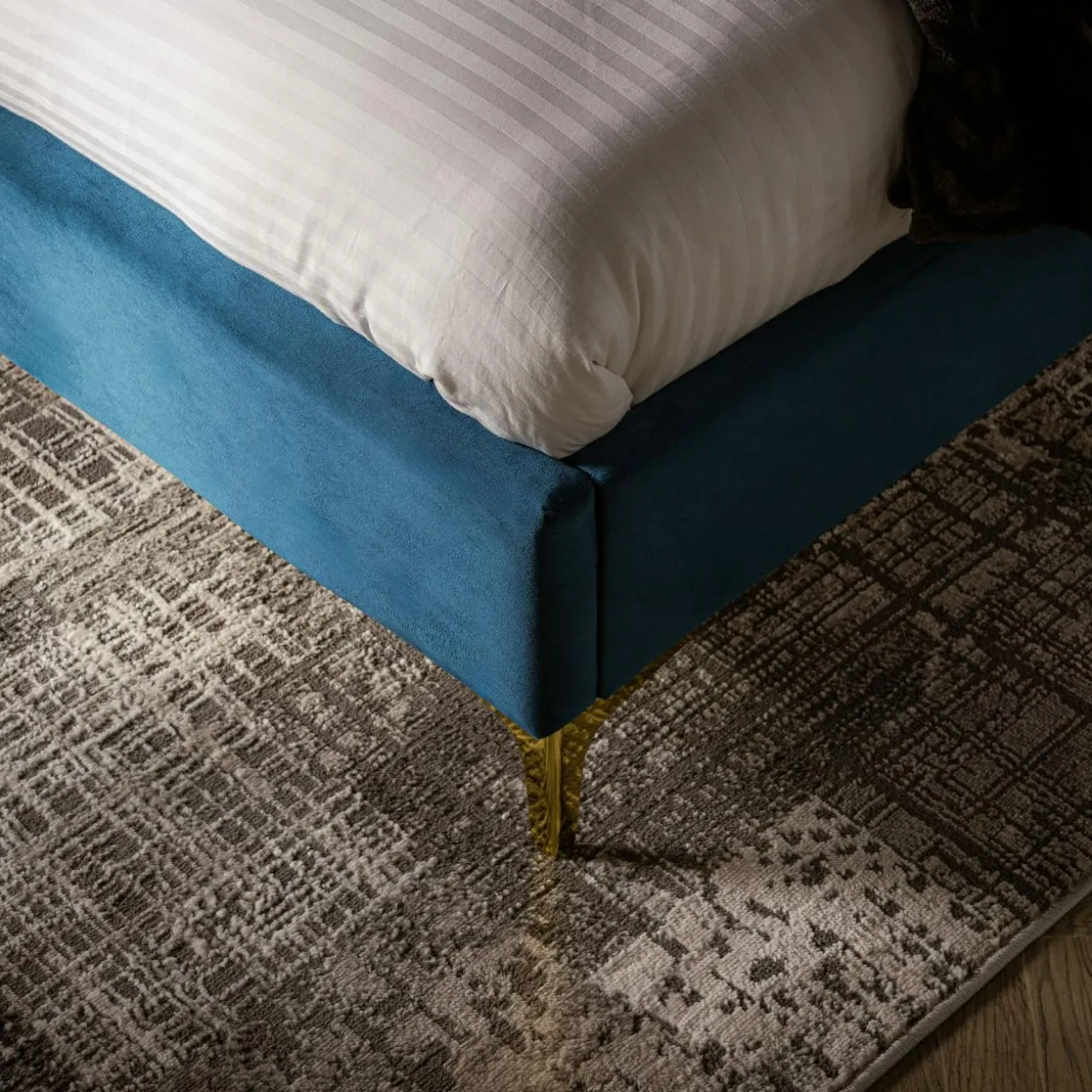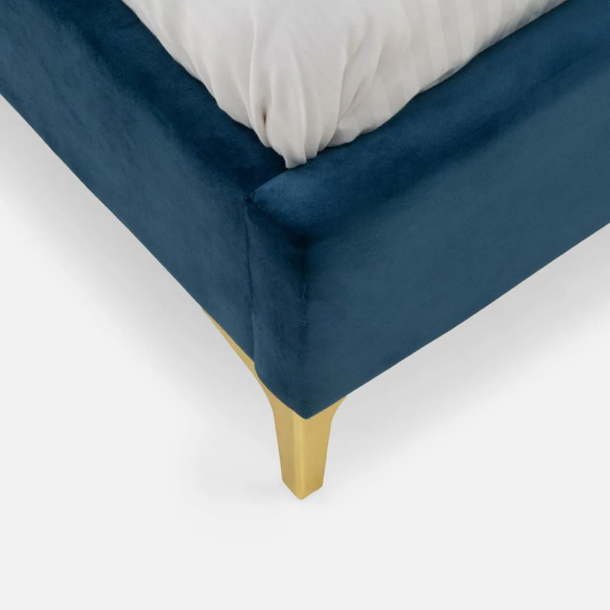 - Niebieska tkanina i złote nóżki podkreślą elegancki wygląd Twojej sypialni.