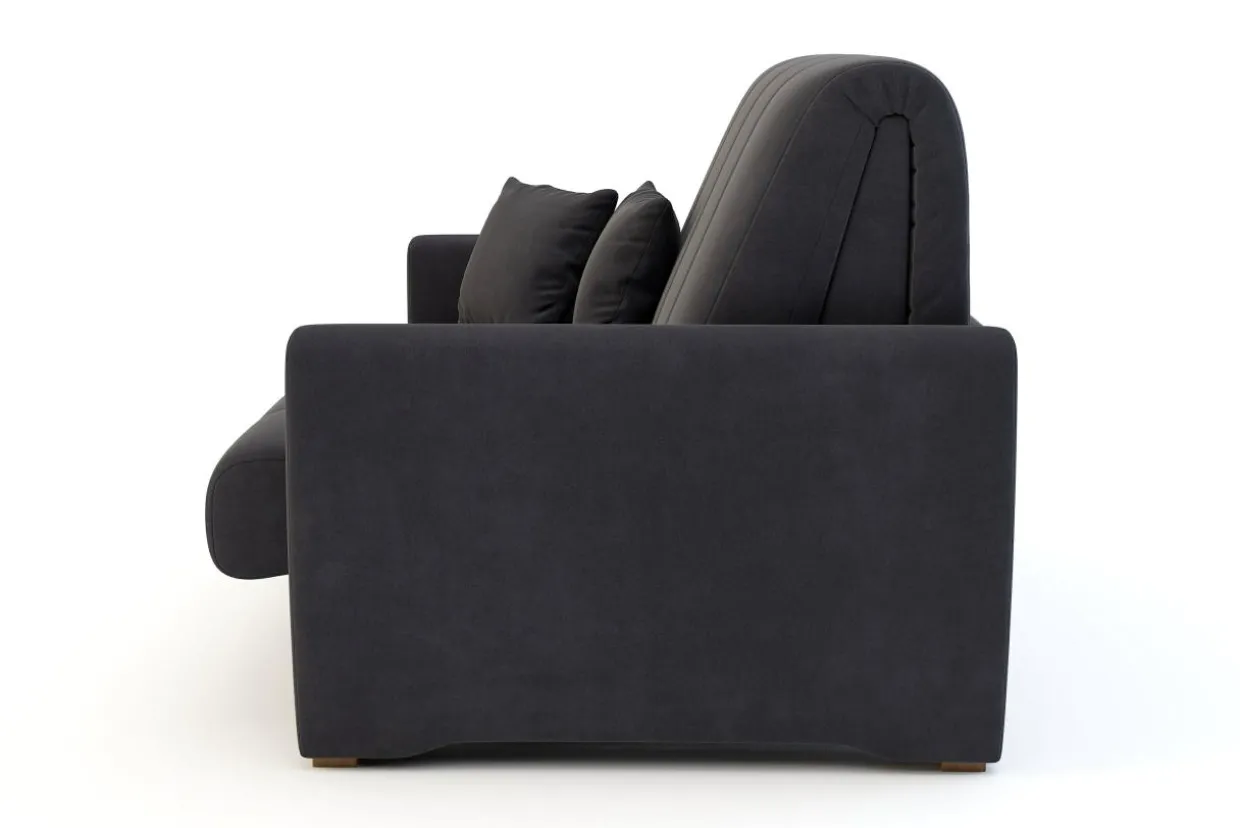 Sofa DALIA została wykończona tkaniną ELEMENT w ciemnoszarym odcieniu. Posiada właściwości trudnopalne i wodoodporne.
