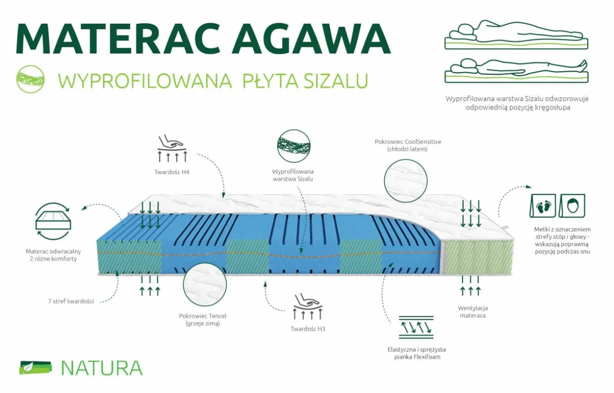 Sizal jest naturalnym tworzywem pozyskiwanym z liści odpowiedniego gatunku rośliny tropikalnej, jaką jest agawa. Włókno sizalowe w optymalny sposób zwiększa stopień twardości konstrukcji materaca. Stworzona z tego surowca warstwa materaca została odpowiednio wyprofilowana, aby zapewnić doskonałą pod kątem anatomicznym pozycję dla kręgosłupa, a jednocześnie dla całej sylwetki- ciało śpiącej osoby jest stabilnie podparte w każdym punkcie.