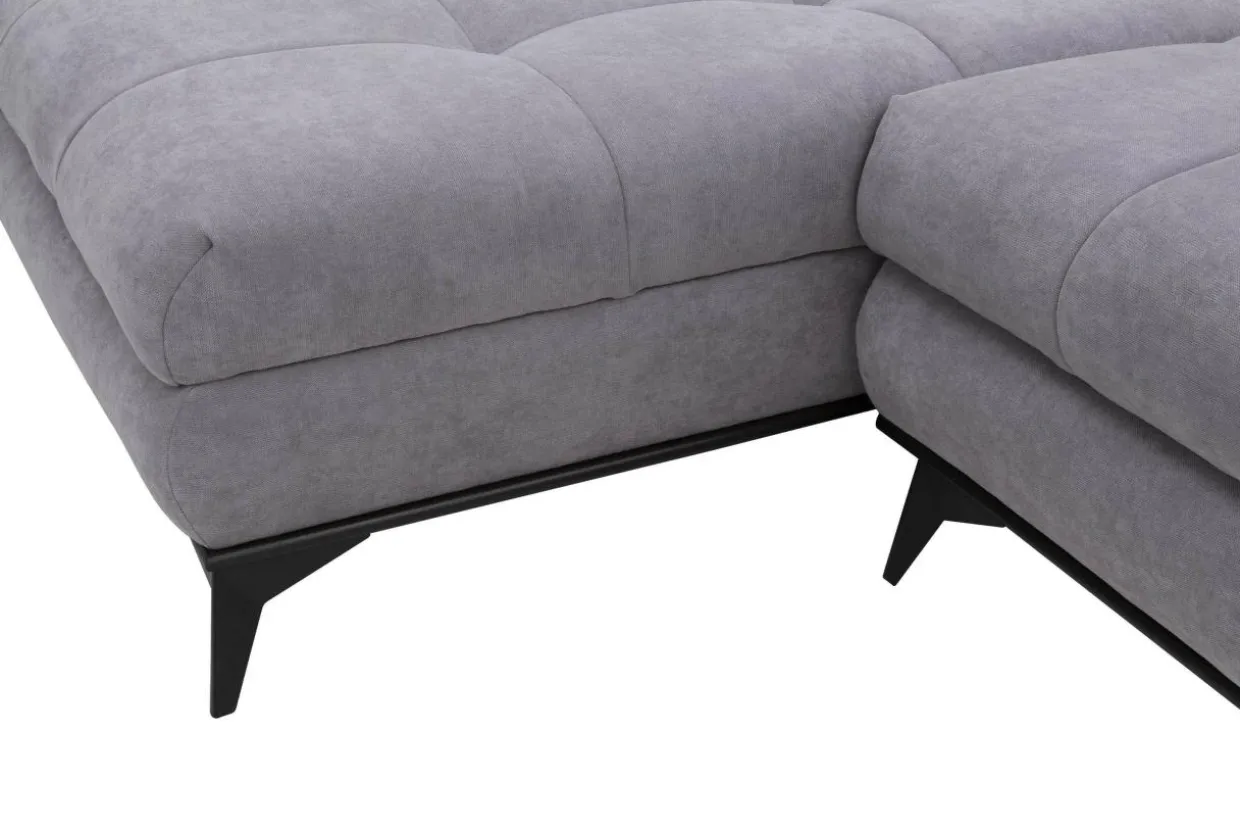 Narożnik pokryty jest miękką i miłą w dotyku welurową tkaniną SORO. Przednie nóżki są metalowe, nóżki pomocnicze pod meblem są wykonane z tworzywa. Elegancji dodaje mu ozdobna drewniana listwa w kolorze wenge, umieszczona wzdłuż spodu siedziska.