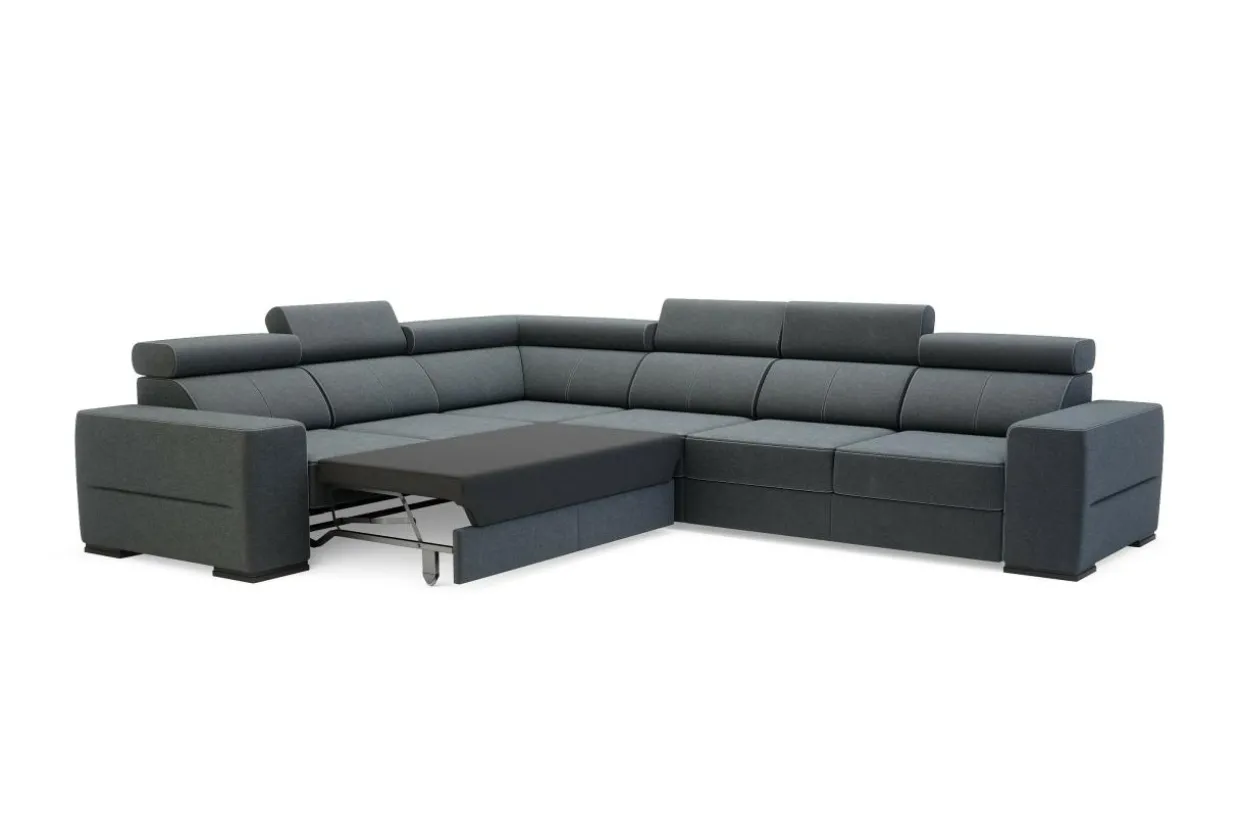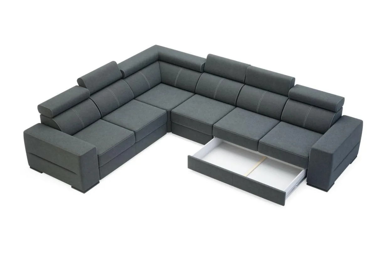 Narożnik APOLLO został wyposażony w funkcję delfin, dzięki której wystarczy podnieść i wysunąć stelaż znajdujący się pod siedziskiem, by uzyskać powierzchnię w pełni przygotowaną do nocnego wypoczynku.