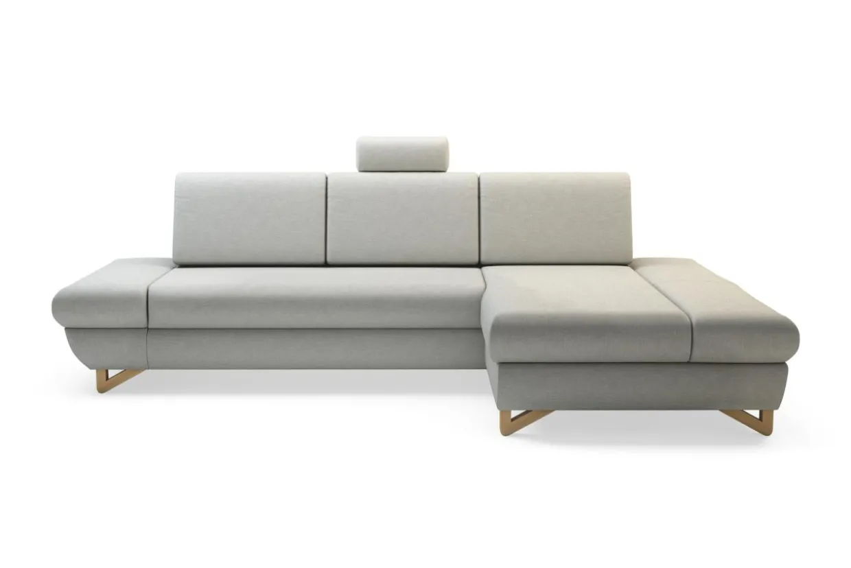 Narożnik AVESTA został przeszyty tkaniną AVRA – materiałem na bazie pluszu, miękkim i miłym w dotyku. Nogi mebla są drewniane, w kolorze dąb sonoma.