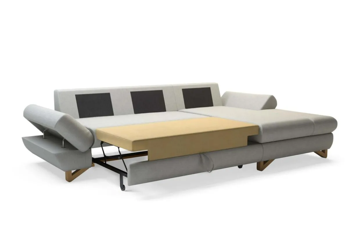 Dzięki zastosowaniu funkcji „delfin” narożnik AVESTA można łatwo rozłożyć. Wystarczy podnieść i wysunąć stelaż znajdujący się pod siedziskiem.