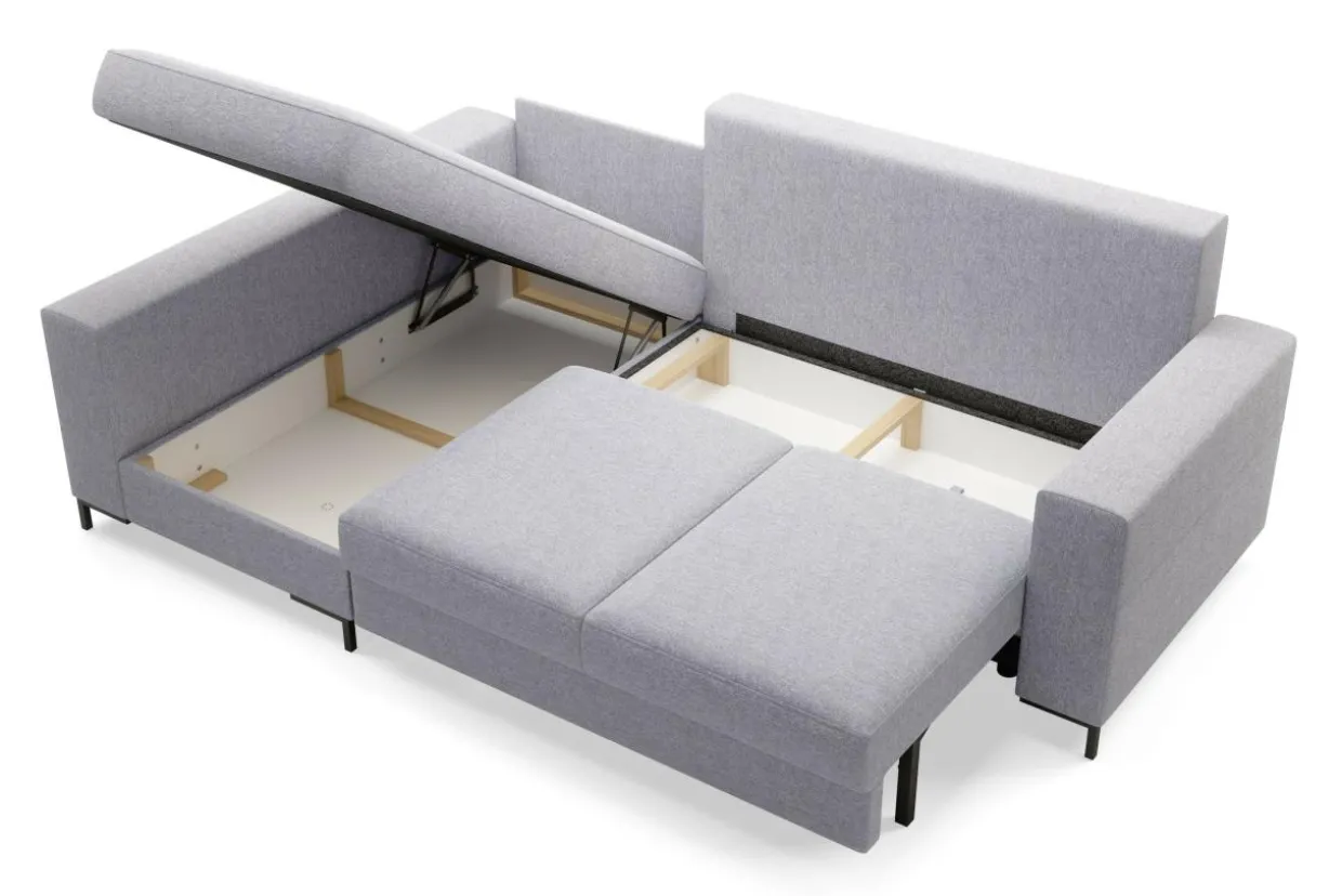 Możecie skorzystać z 4 poduch oparciowych. siedząc lub wylegiwać się na rozłożonym narożniku. 2 pojemniki na pościel umożliwią przechowywanie pościeli i innych tekstyliów w salonie.