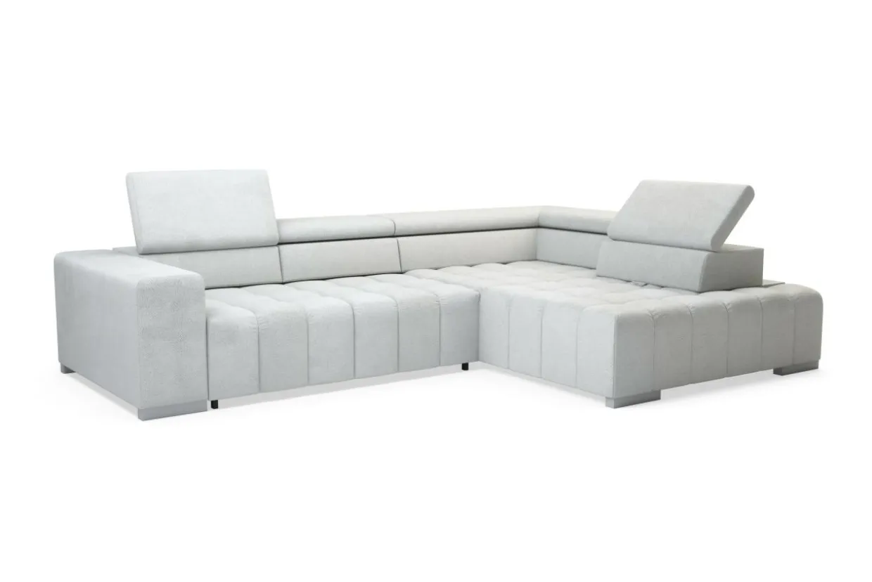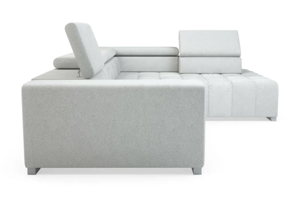 Mebel wykończono przyjemną w dotyku tkaniną, o ciekawej strukturze. Stonowany, szary kolor narożnika optycznie zwiększy przestrzeń, a przyjemna faktura nada wnętrzom subtelności i przytulności.