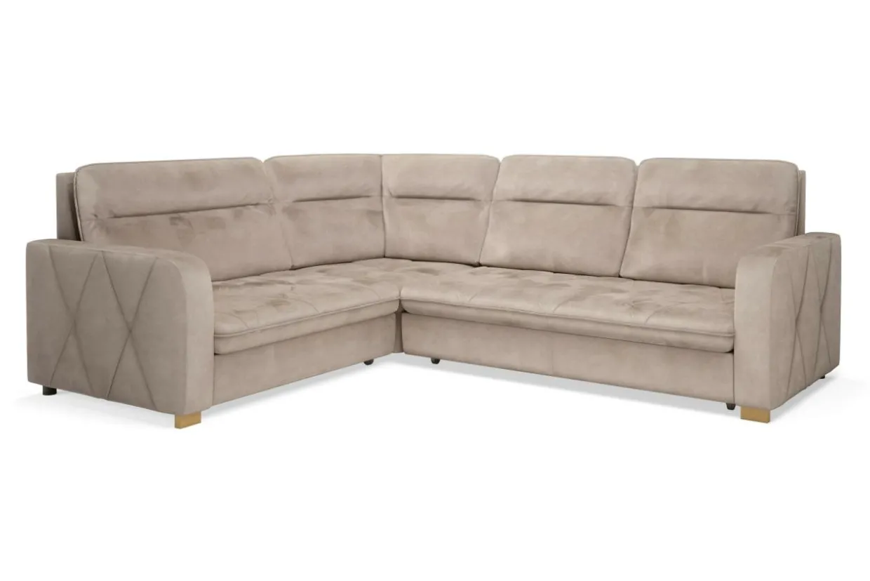 Narożnik SOLAR pokryto welurową tkaniną w beżowym – delikatnym kolorze. Bardzo przyjemnie jest dotykać jej miękkiej powierzchni.