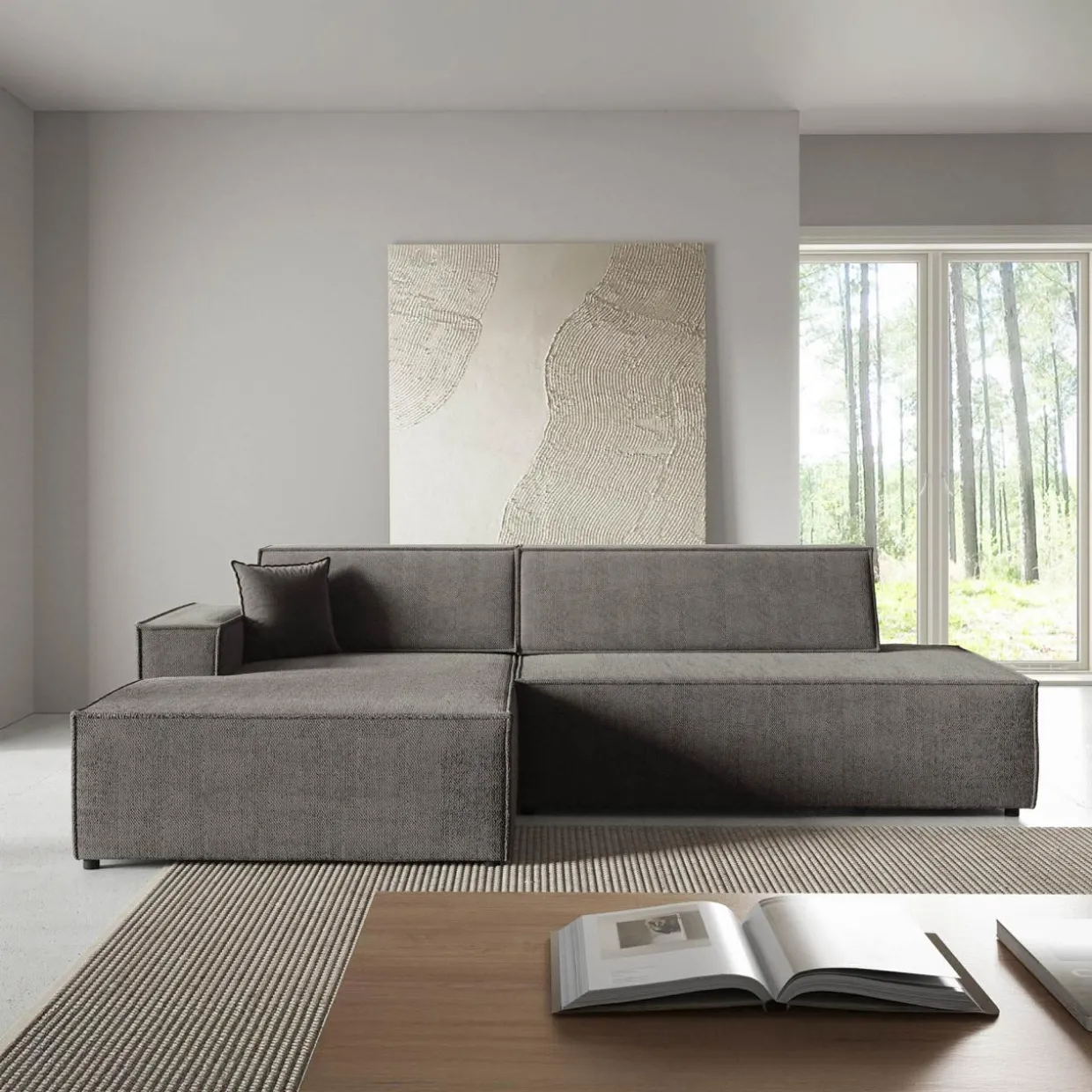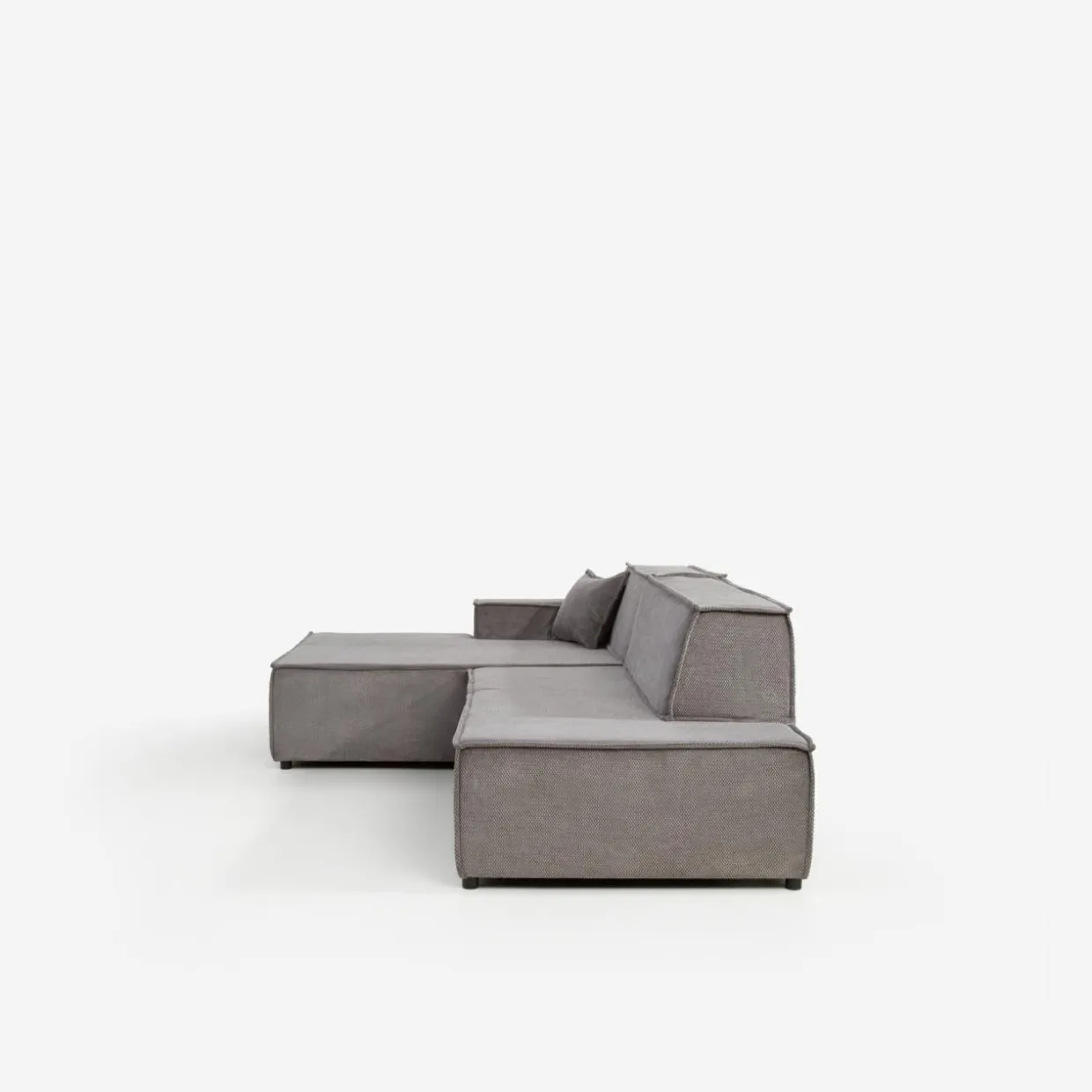 Narożnik w głębokim odcieniu ciemnej szarości doskonale sprawdzi się w nowoczesnych, loftowych lub industrialnych aranżacjach.