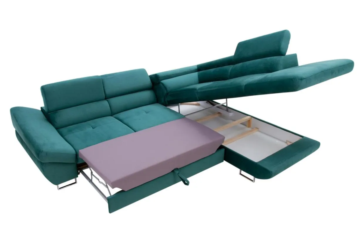 Narożnik możesz rozłożyć bez konieczności odsuwania go od ściany. Wystarczy wysunąć element spod siedziska, by stworzyć przestrzeń do przenocowania gościa.