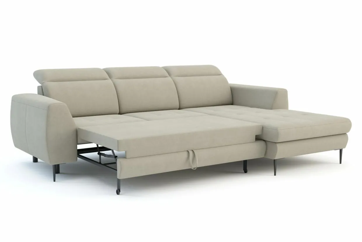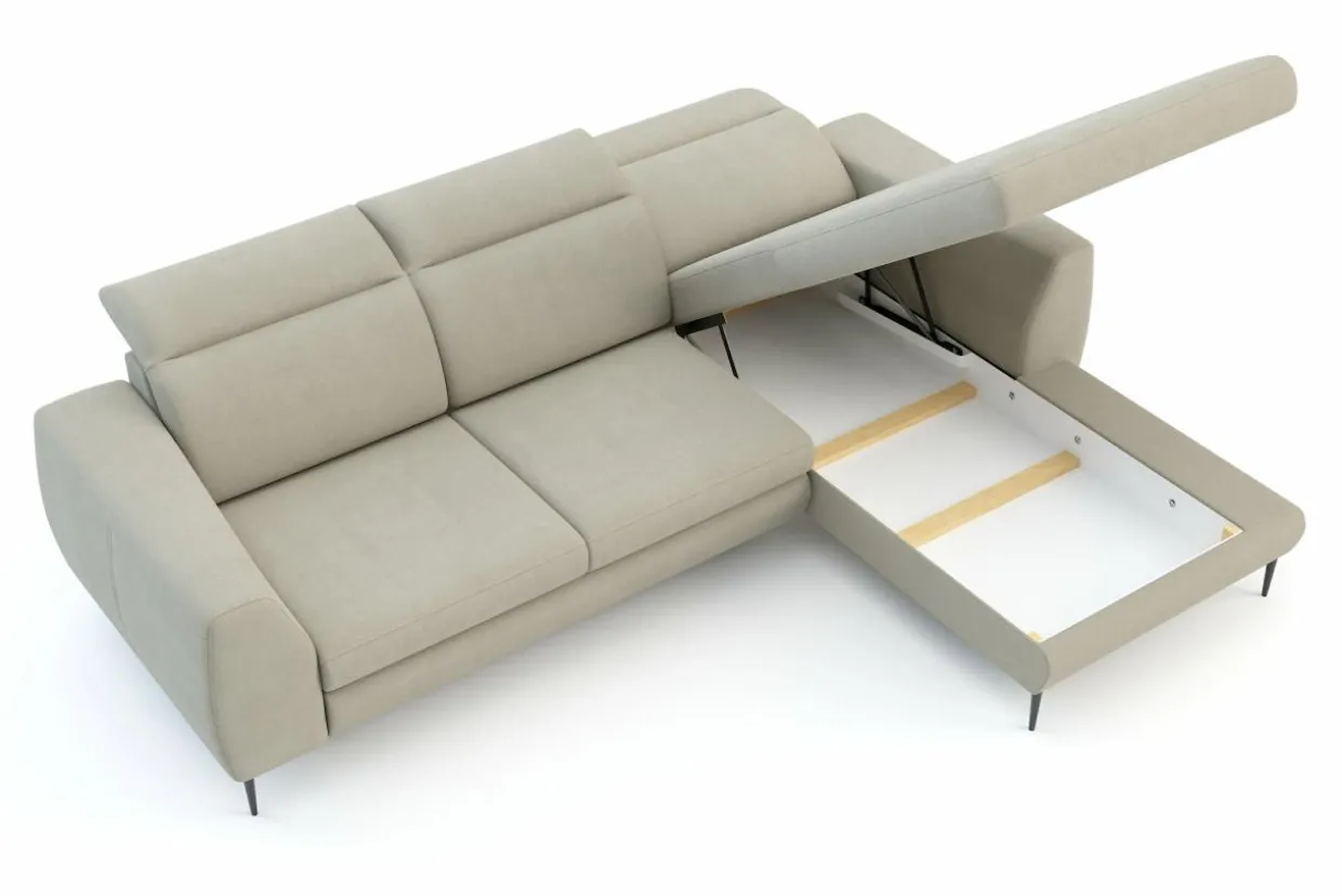 Narożnik oferuje okazjonalną funkcję spania. System rozkładania typu nurek to wygodny i szybki mechanizm. Wystarczy wysunąć szufladę, pociągnąć za specjalny uchwyt i rozłożyć narożnik.