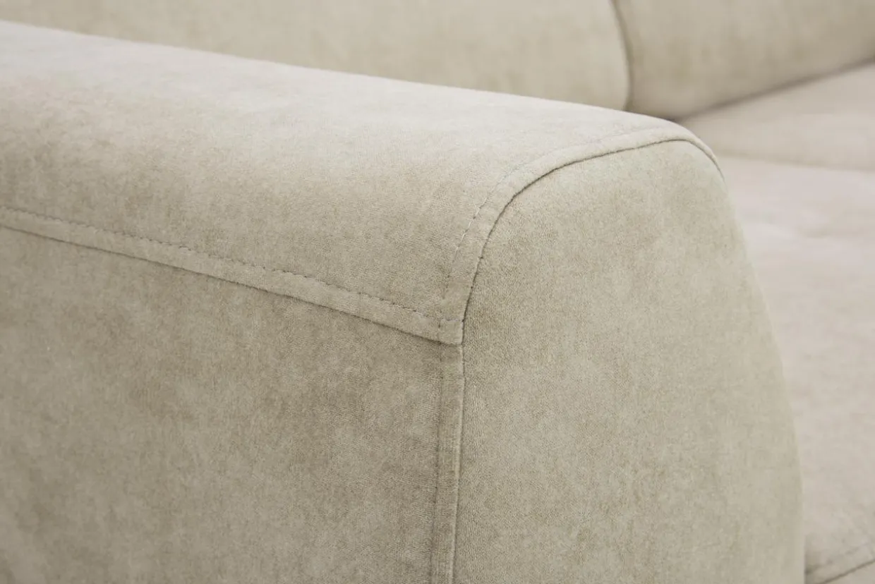 Narożnik obito tkaniną ZETTA w beżowym, jasnym kolorze, który będzie doskonałą bazą pod pozostałe meble w aranżacji nowoczesnego salonu.