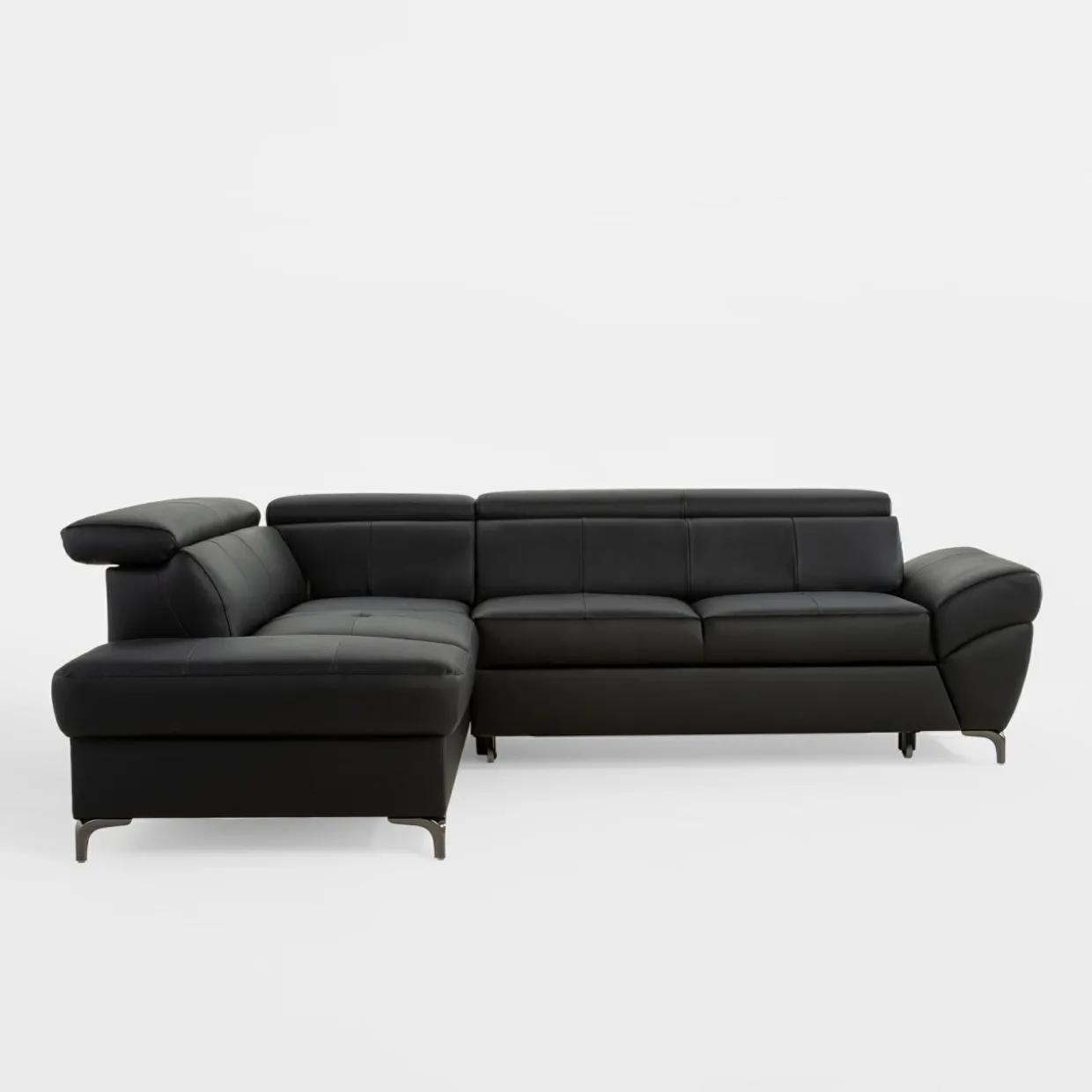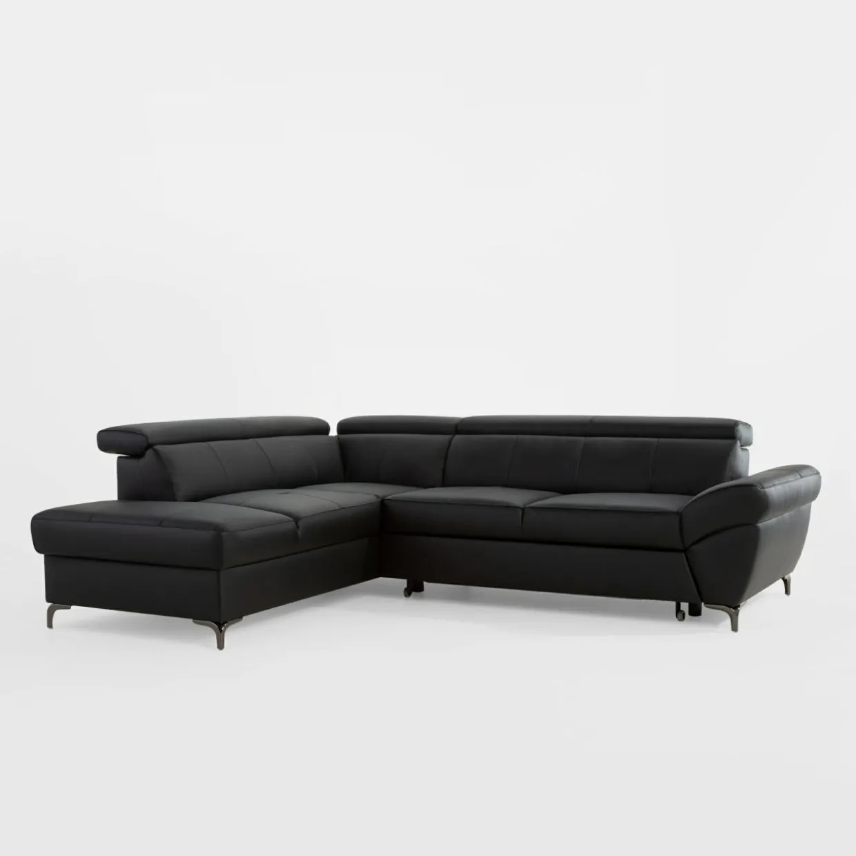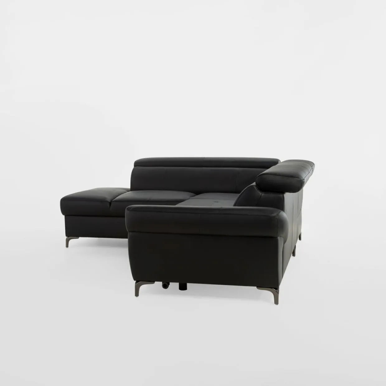 Narożnik MEMPHIS można rozkładać, ma skórzane wykończenie oraz elegancki – grafitowy kolor. Wyposażono go w regulowane zagłówki i pojemnik na pościel.