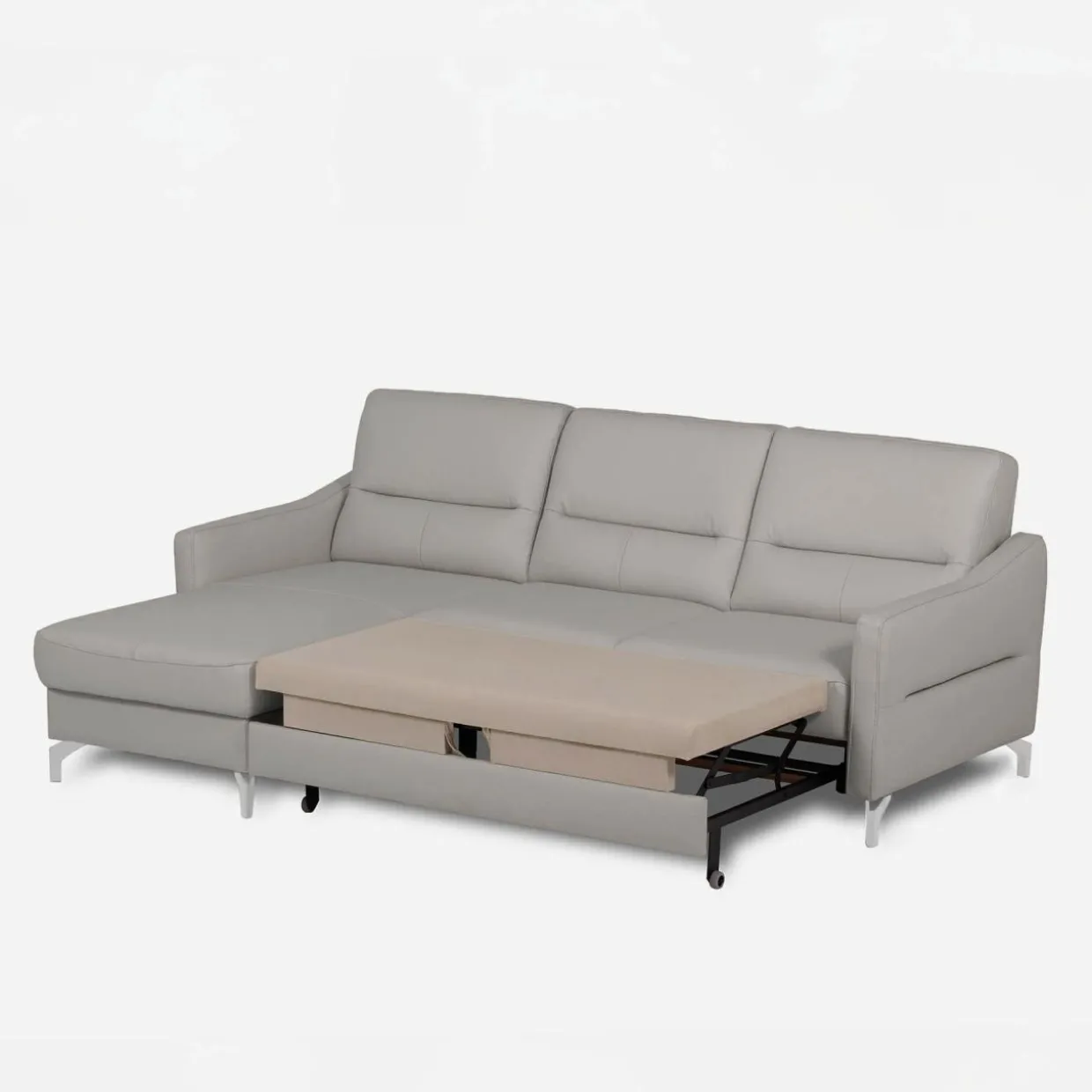 Stelaż pod siedziskiem wysuwamy i podnosimy za pomocą uchwytu. Mebel nie wymaga odsuwania od ściany. Idealny do okazjonalnego spania.