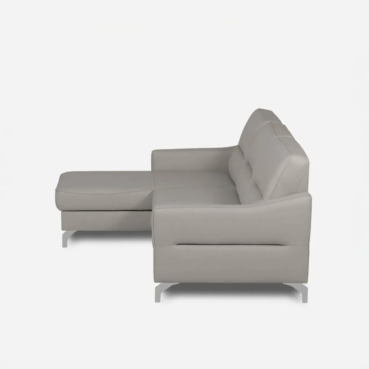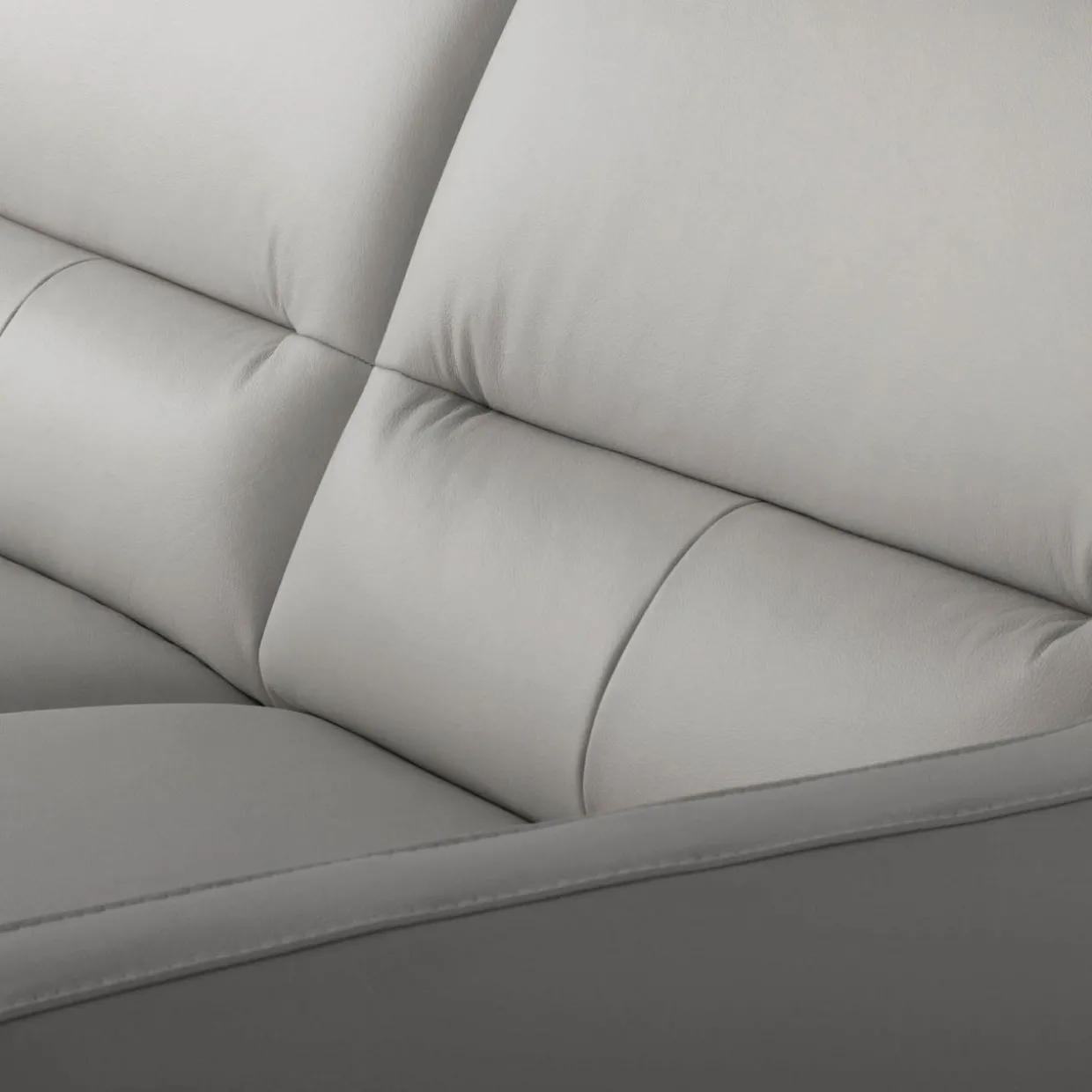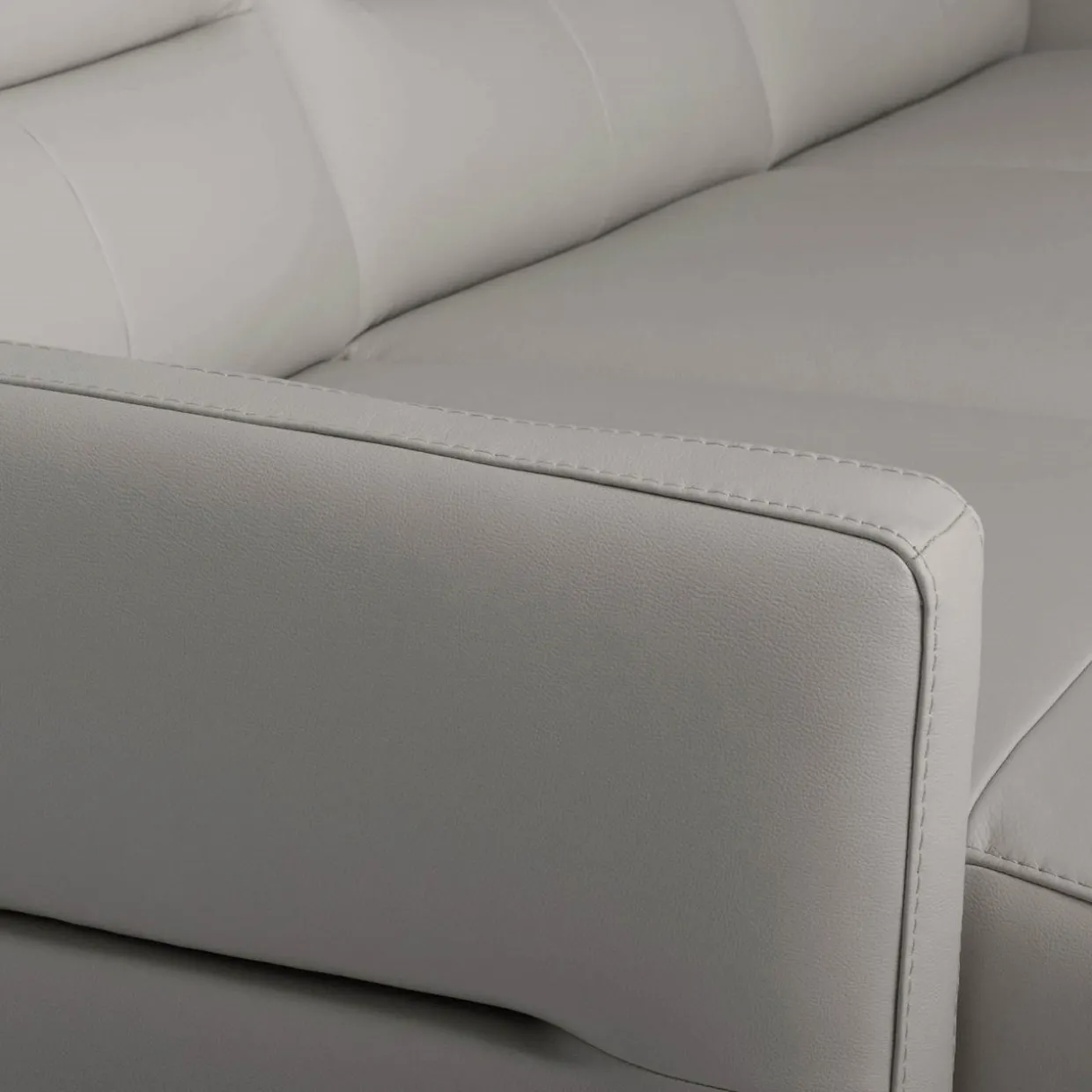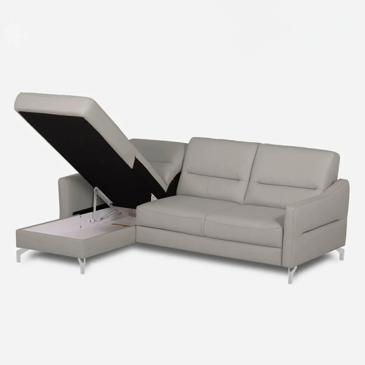 - Narożnik obity jest mixem skór (naturalna i ekologiczna) w kolorze jasnoszarym.