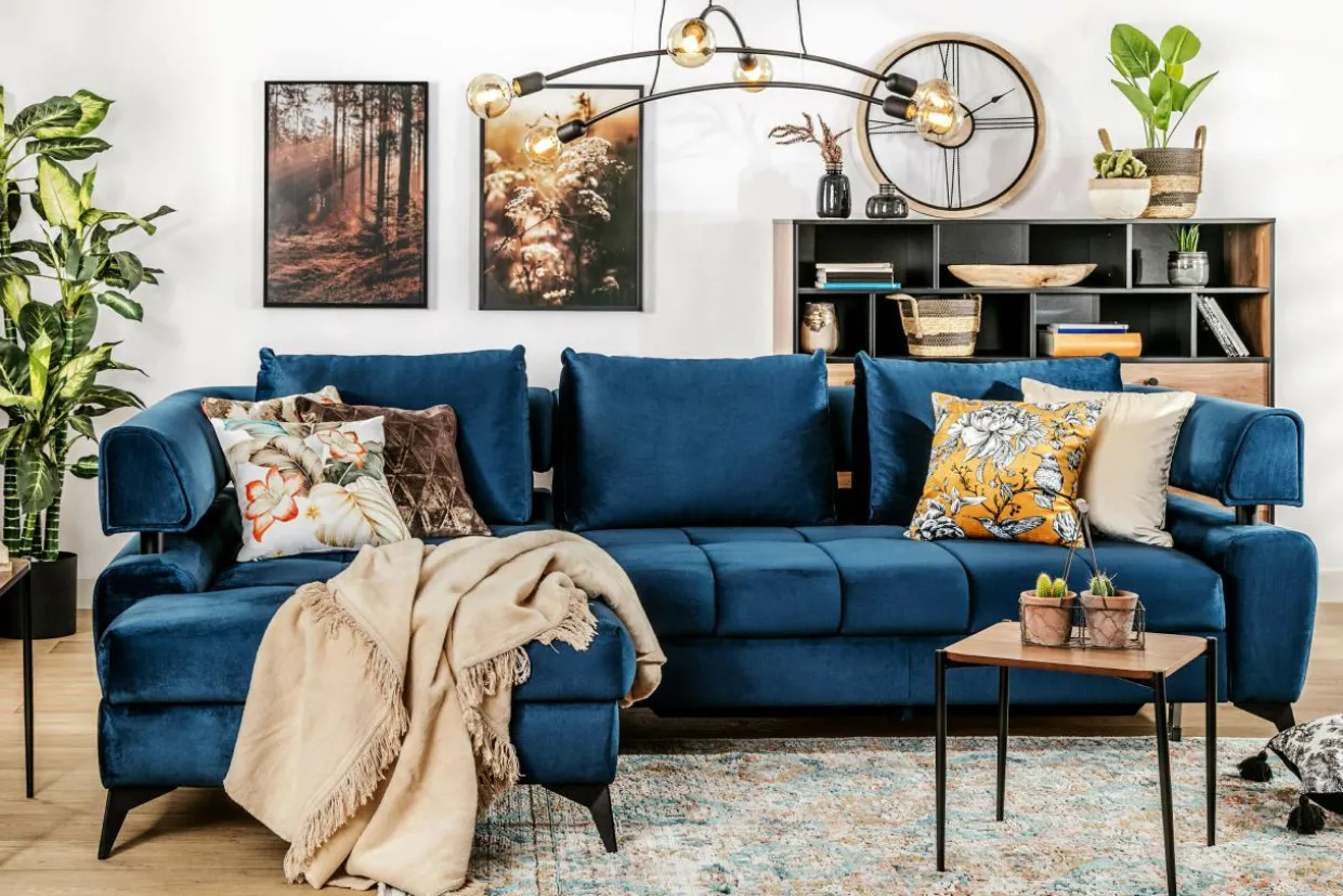 Narożnik ustawiono na metalowych, malowanych na czarno nóżkach, które wraz z granatową tkaniną tworzą interesujący kontrast.