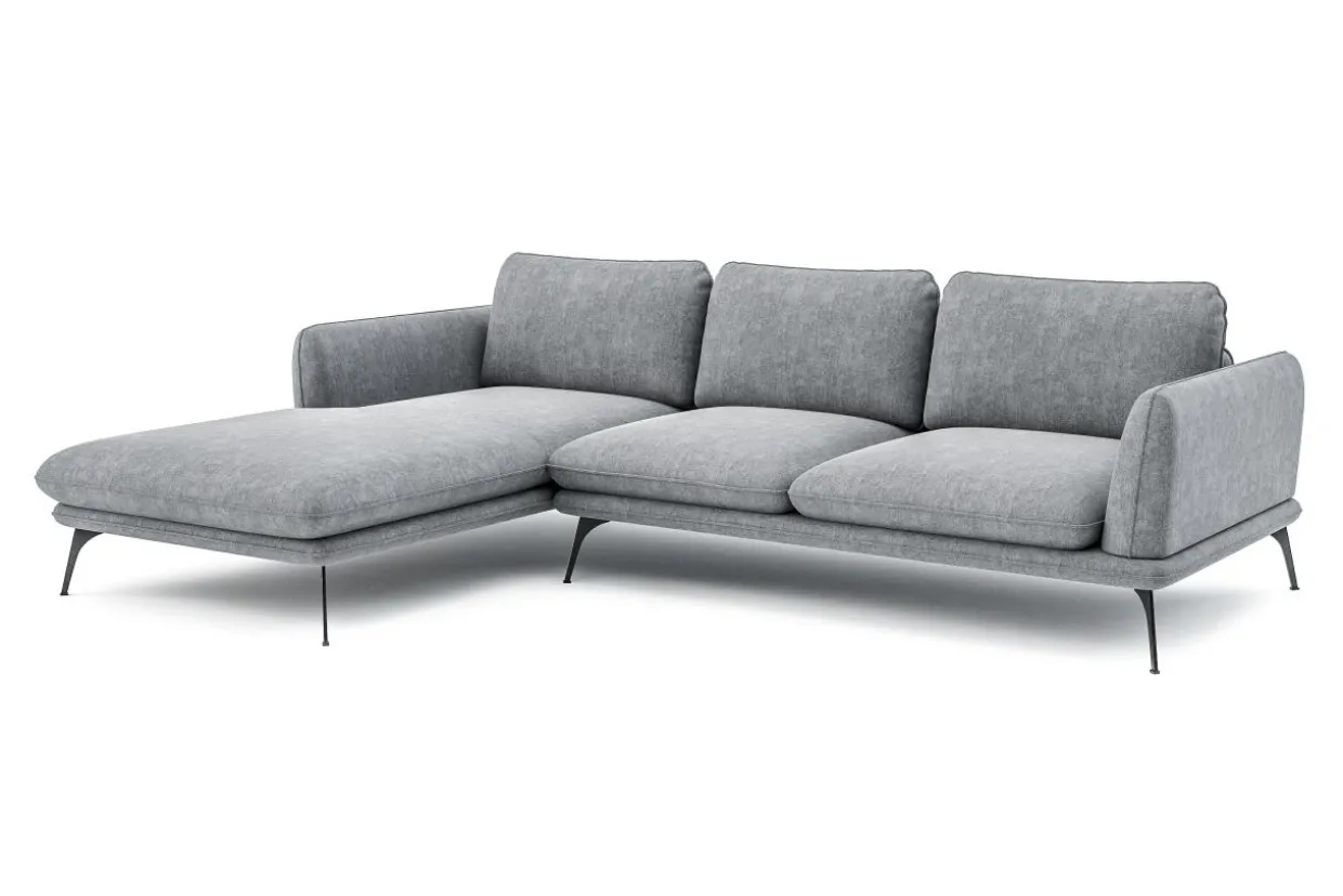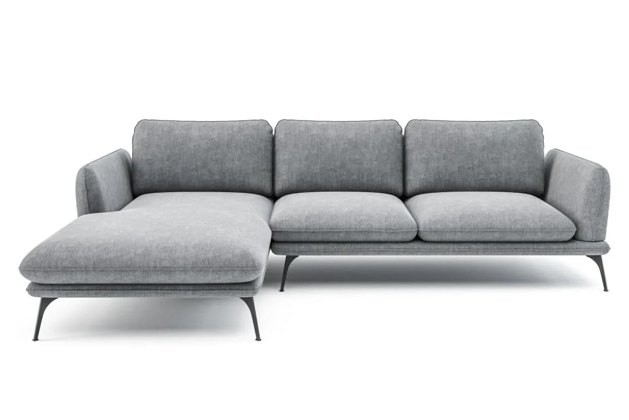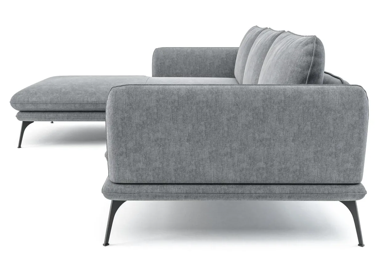 Narożnik pokryto szarą tkaniną welurową. Jej miękkość sprawi, że przybywanie w salonie będzie jeszcze przyjemniejsze.