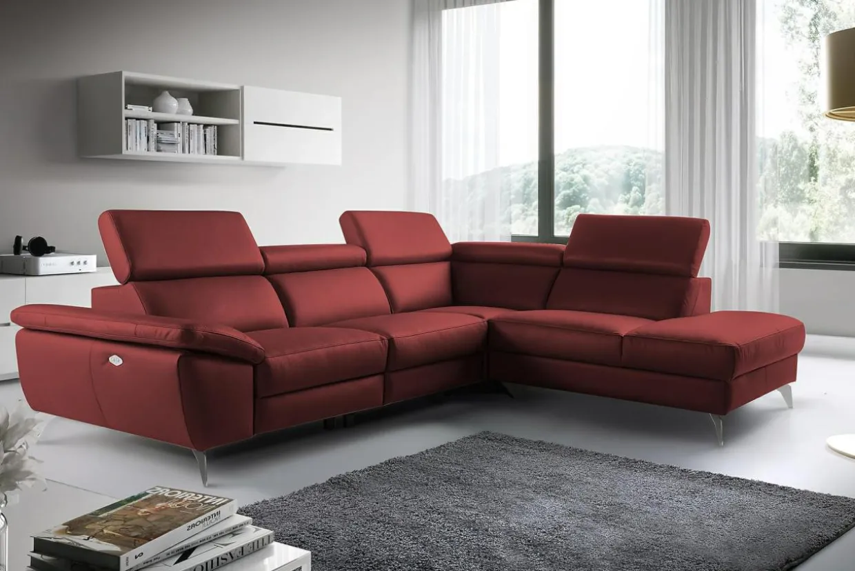 Narożnik została pokryty skórą naturalną z kolekcji DOLLARO w odcieniu RED. Metalowe nóżki podkreślają nowoczesny charakter narożnika i nadają mu nieco smukłości.