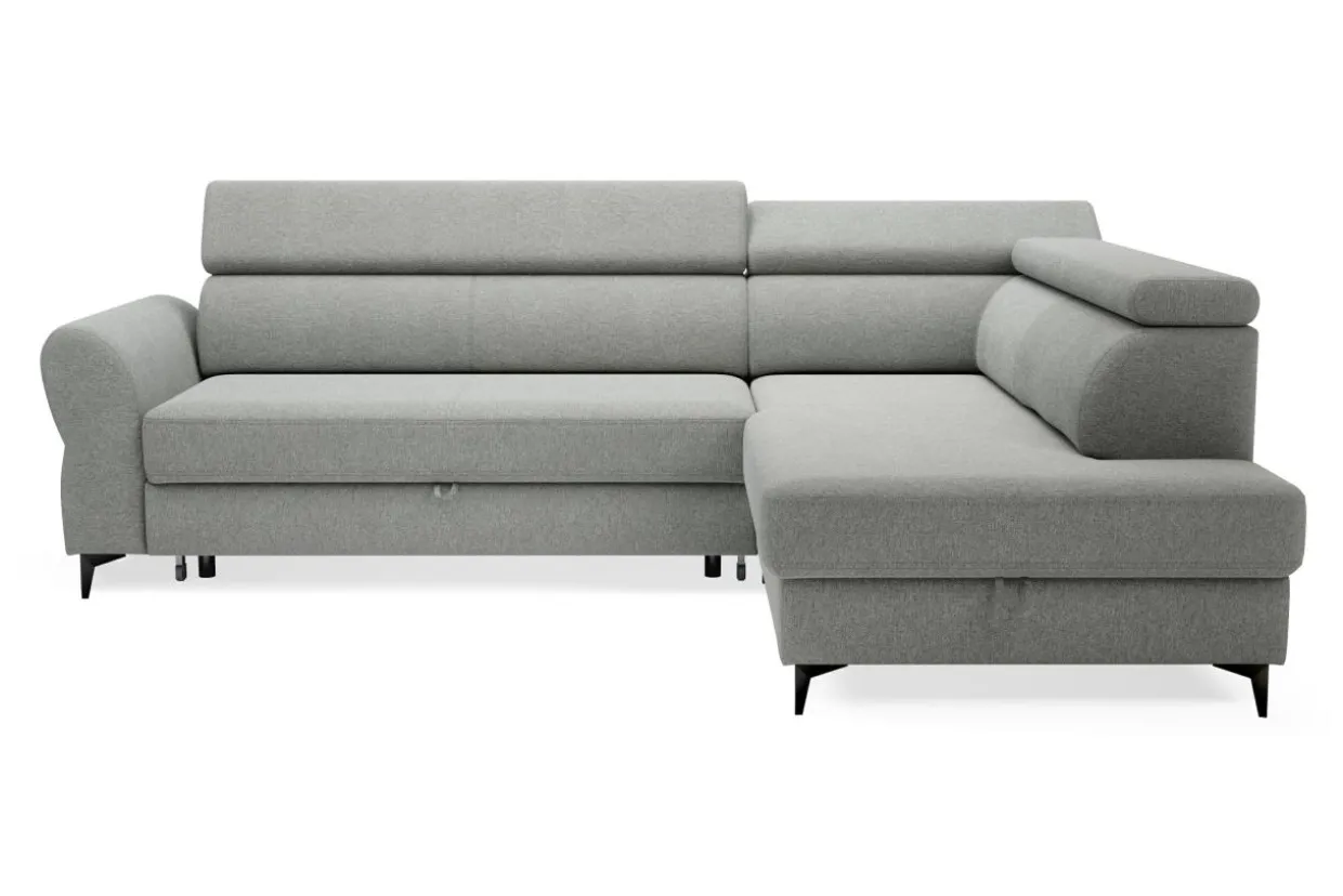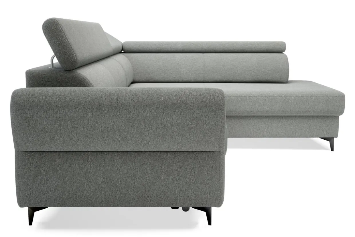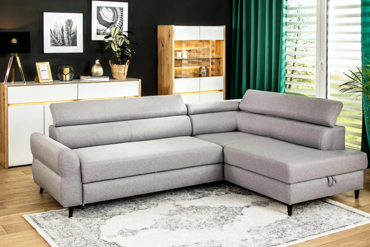 Szara tapicerka sprawia, że narożnik dobrze prezentuje się w każdym pokoju urządzonym w chłodnej kolorystyce.