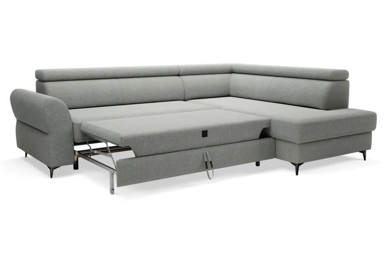 Narożnik REMO możesz rozłożyć bez konieczności odsuwania od ściany. Spory pojemnik na pościel znajduje się w otomanie, dlatego możesz z niego korzystać niezależnie od tego, czy narożnik jest rozłożony czy nie.