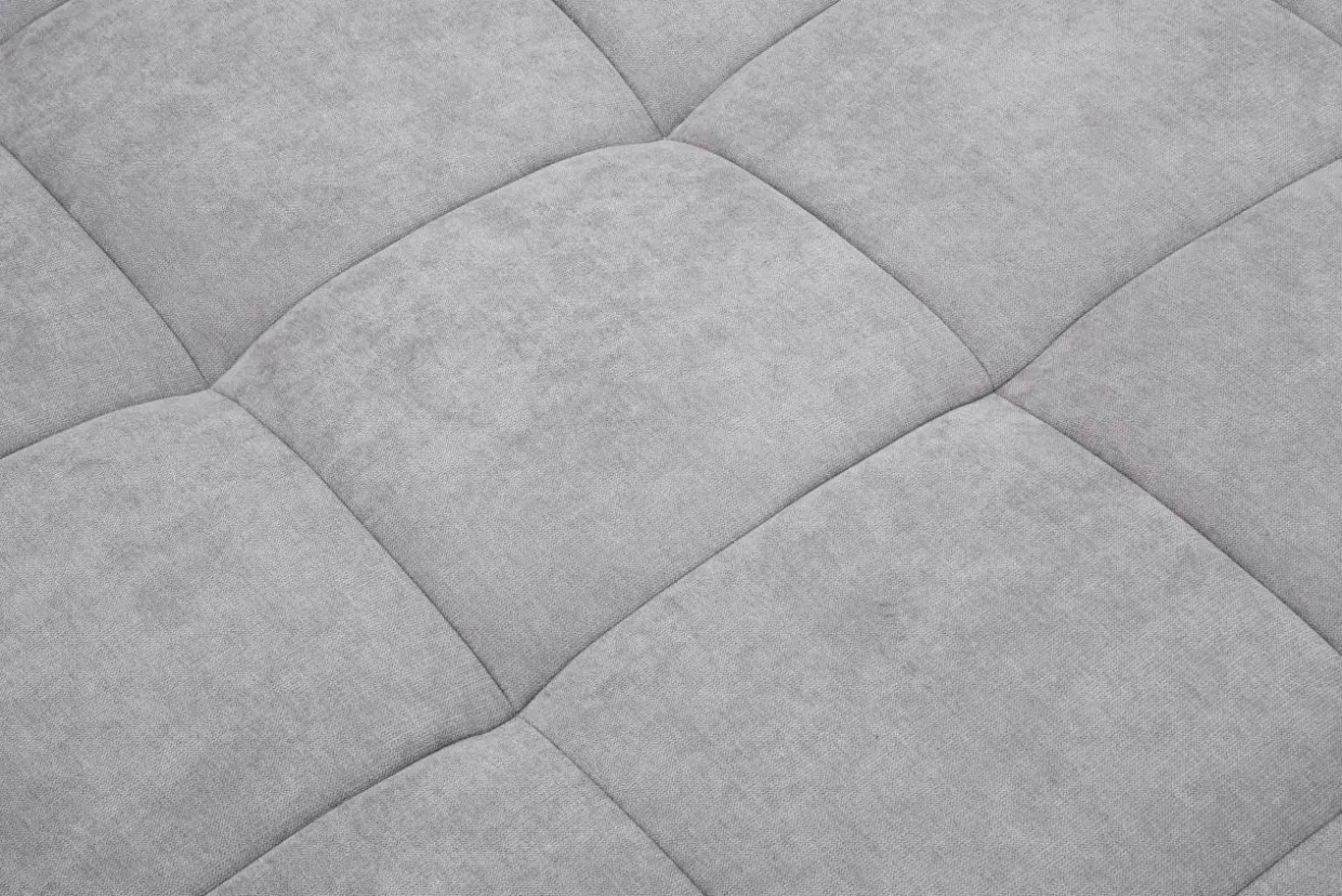 Narożnik został przeszyty w całości szarą tkaniną SORO – materiałem łatwym do utrzymania w czystości, a jednocześnie miękkim i przyjemnym w dotyku.