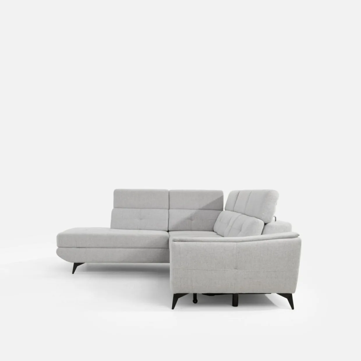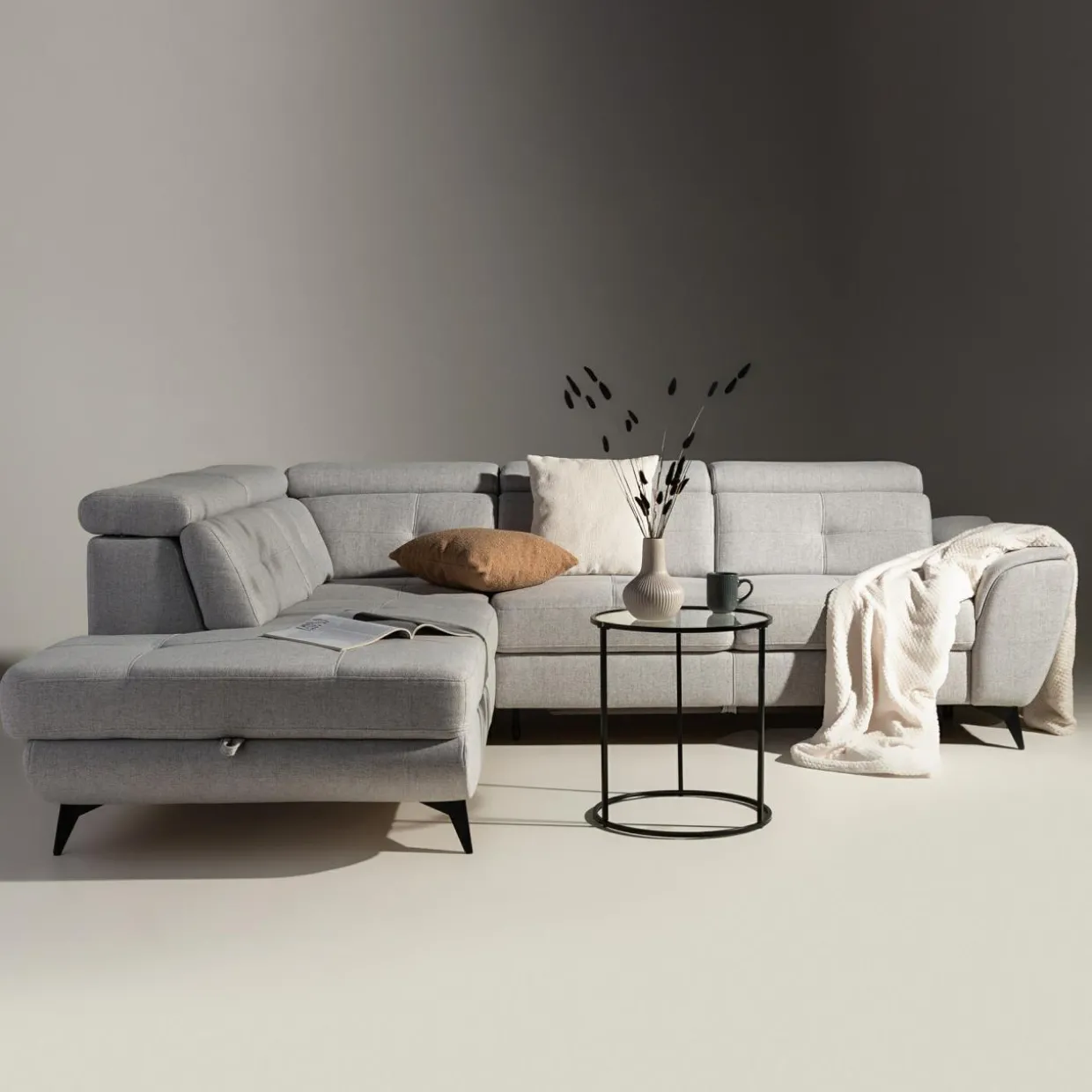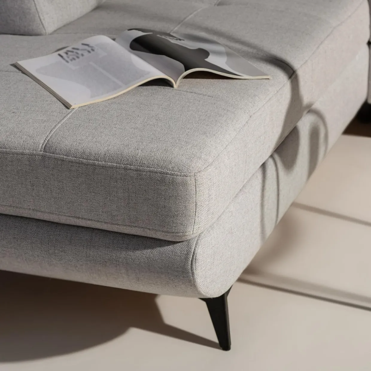 SERGIO to średniej wielkości narożnik wykończony w całości tkaniną NEVE w szarym kolorze.