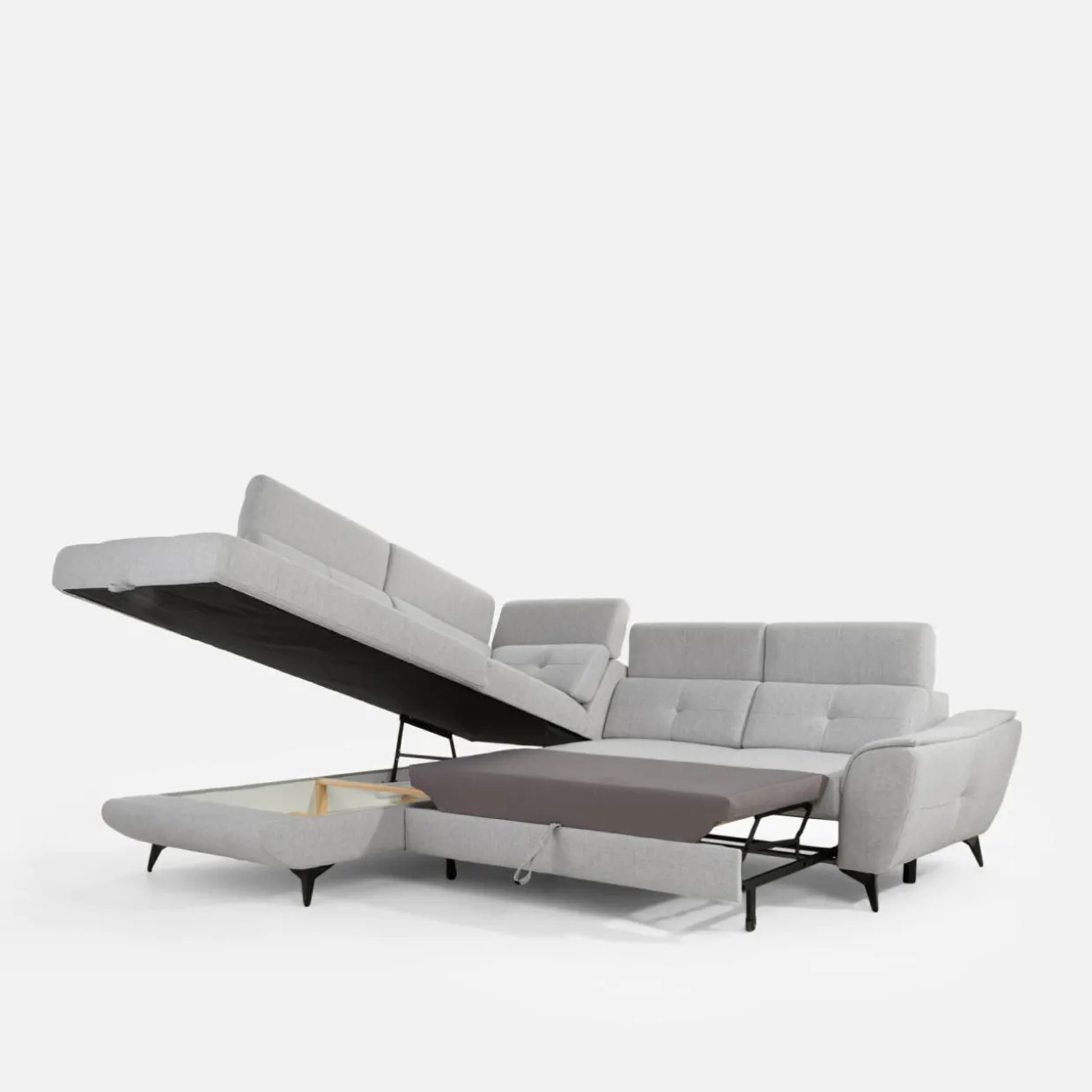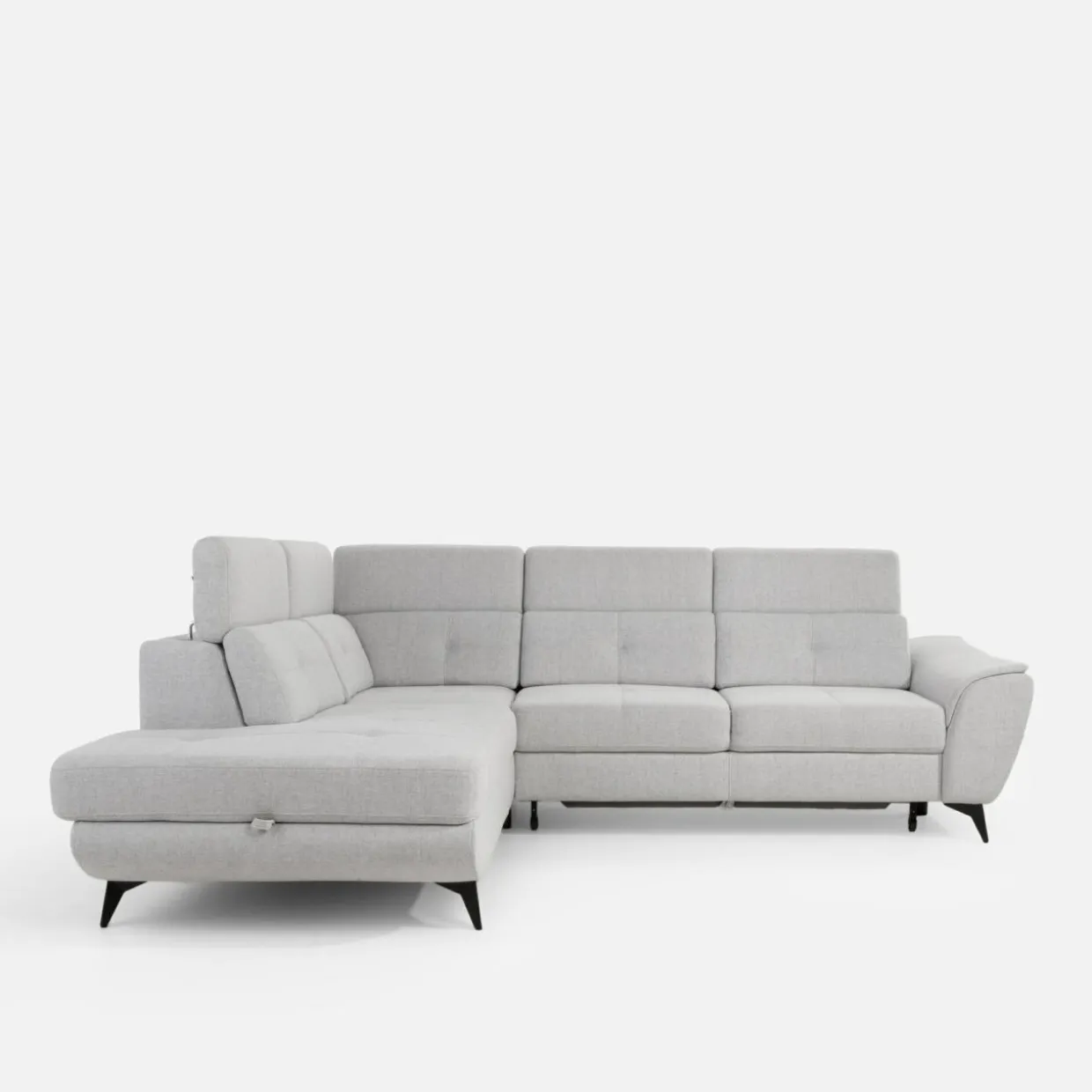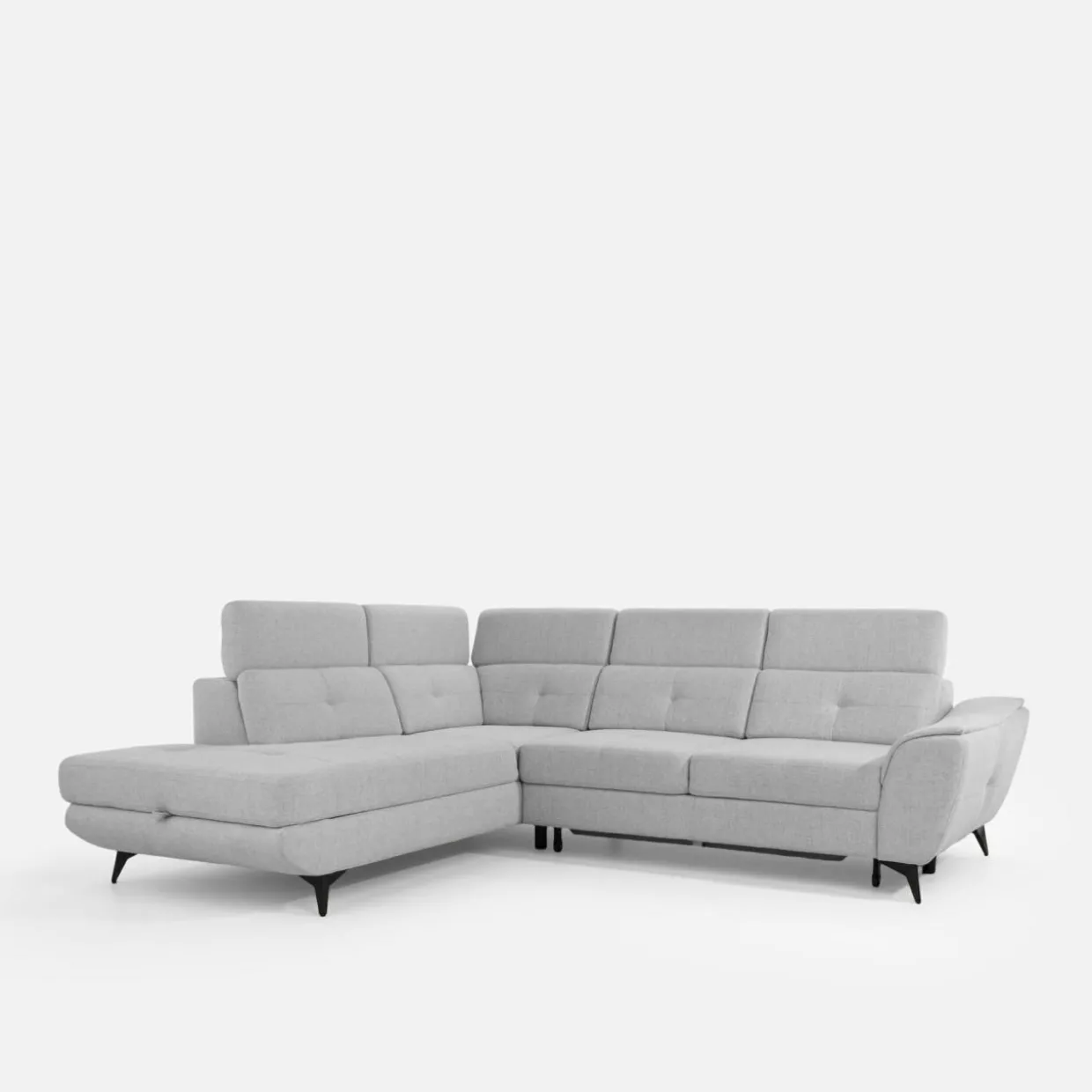 SERGIO to średniej wielkości narożnik wykończony w całości tkaniną NEVE w szarym kolorze.