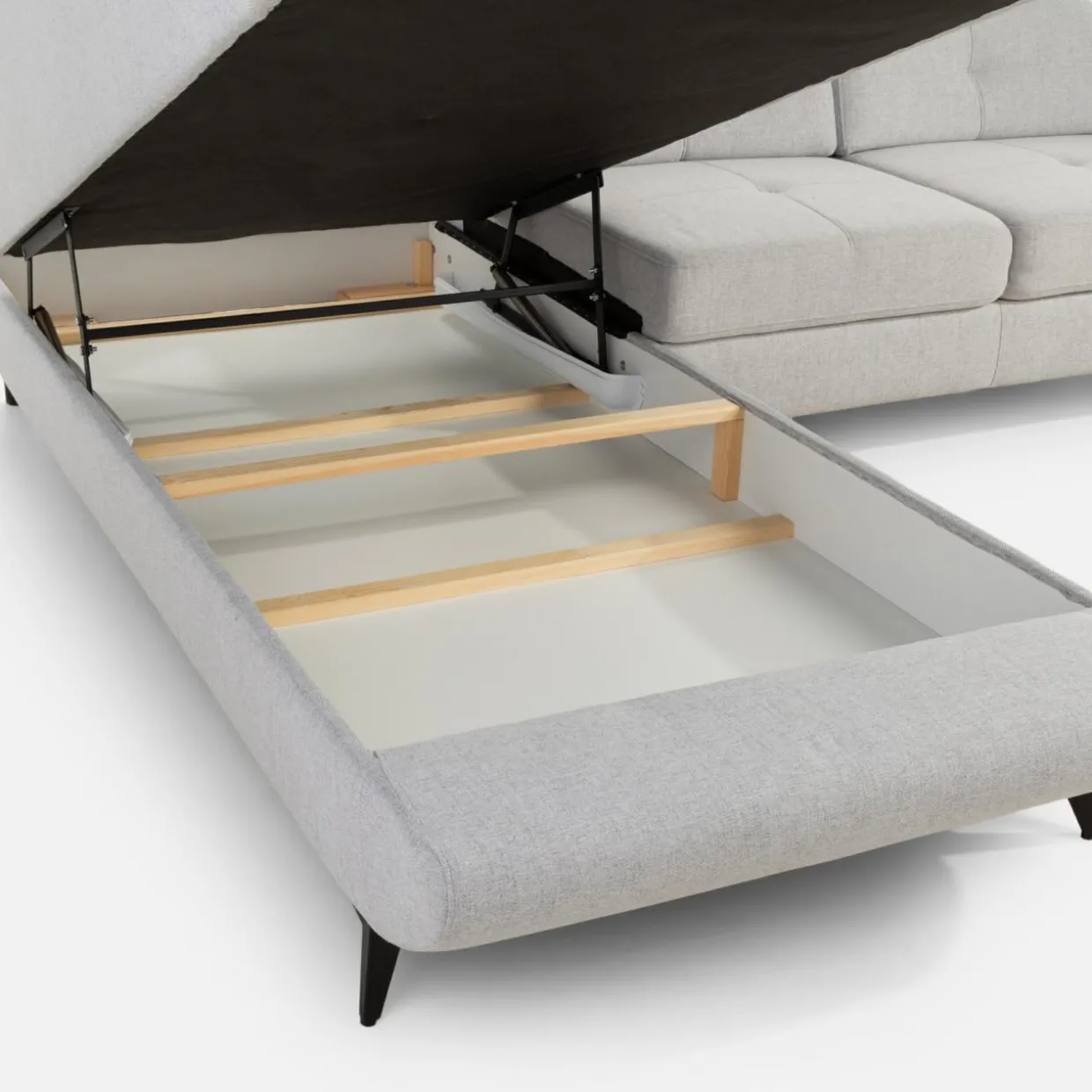 Pod leżanką znajduje się pojemnik na pościel. Podnoszenie ułatwia uchwyt i specjalny mechanizm.