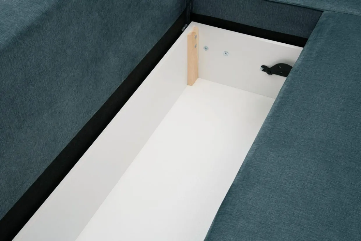 - Domowe tekstylia schowasz do pojemnika na pościel pod siedziskiem.