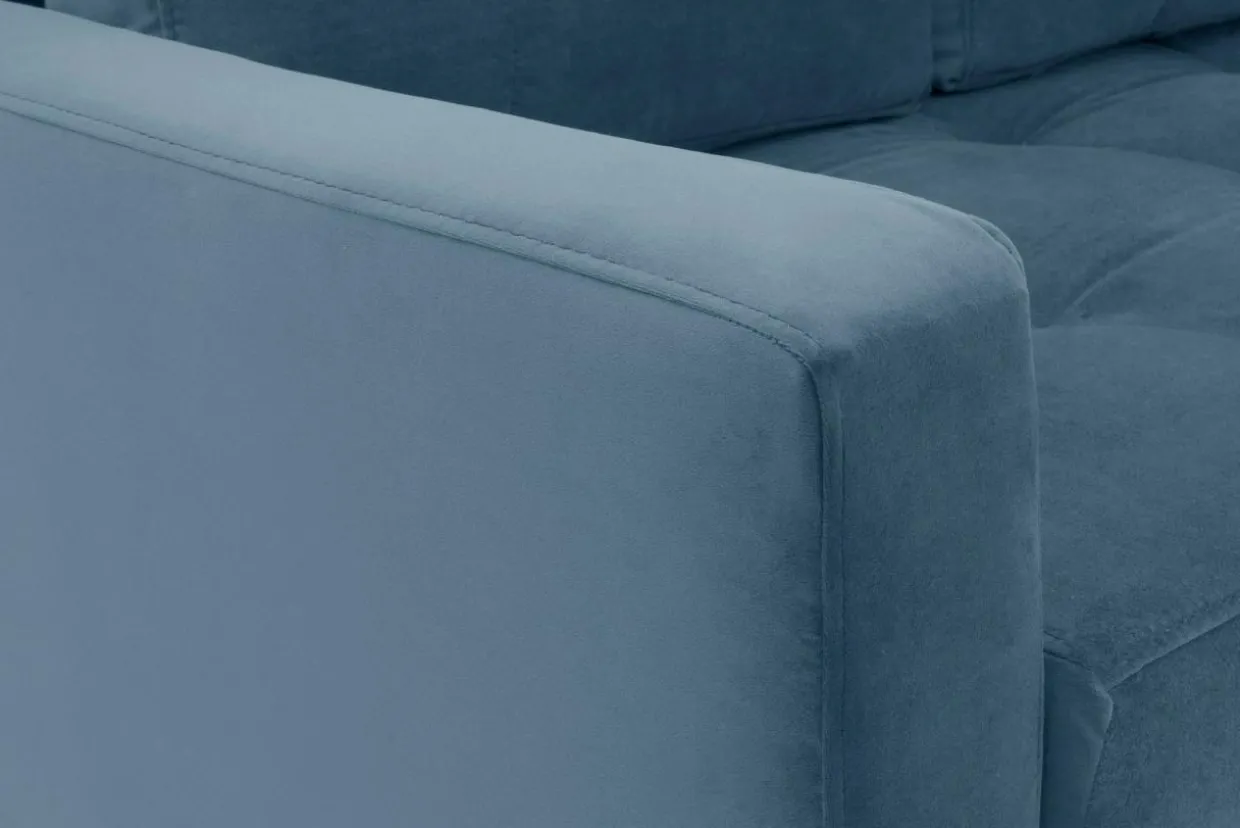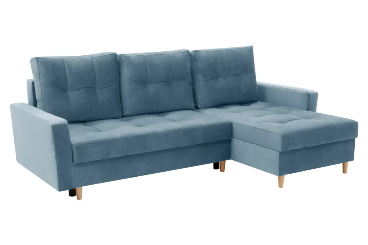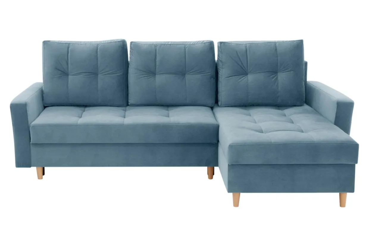 - Odcień niebieski i drewniane nóżki sprawiają, że narożnik stworzy w Twoim salonie klimat nadmorskich wakacji.