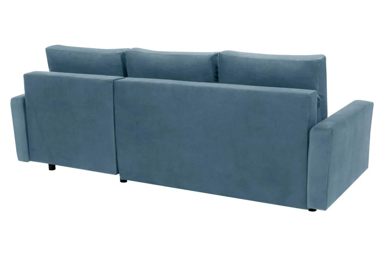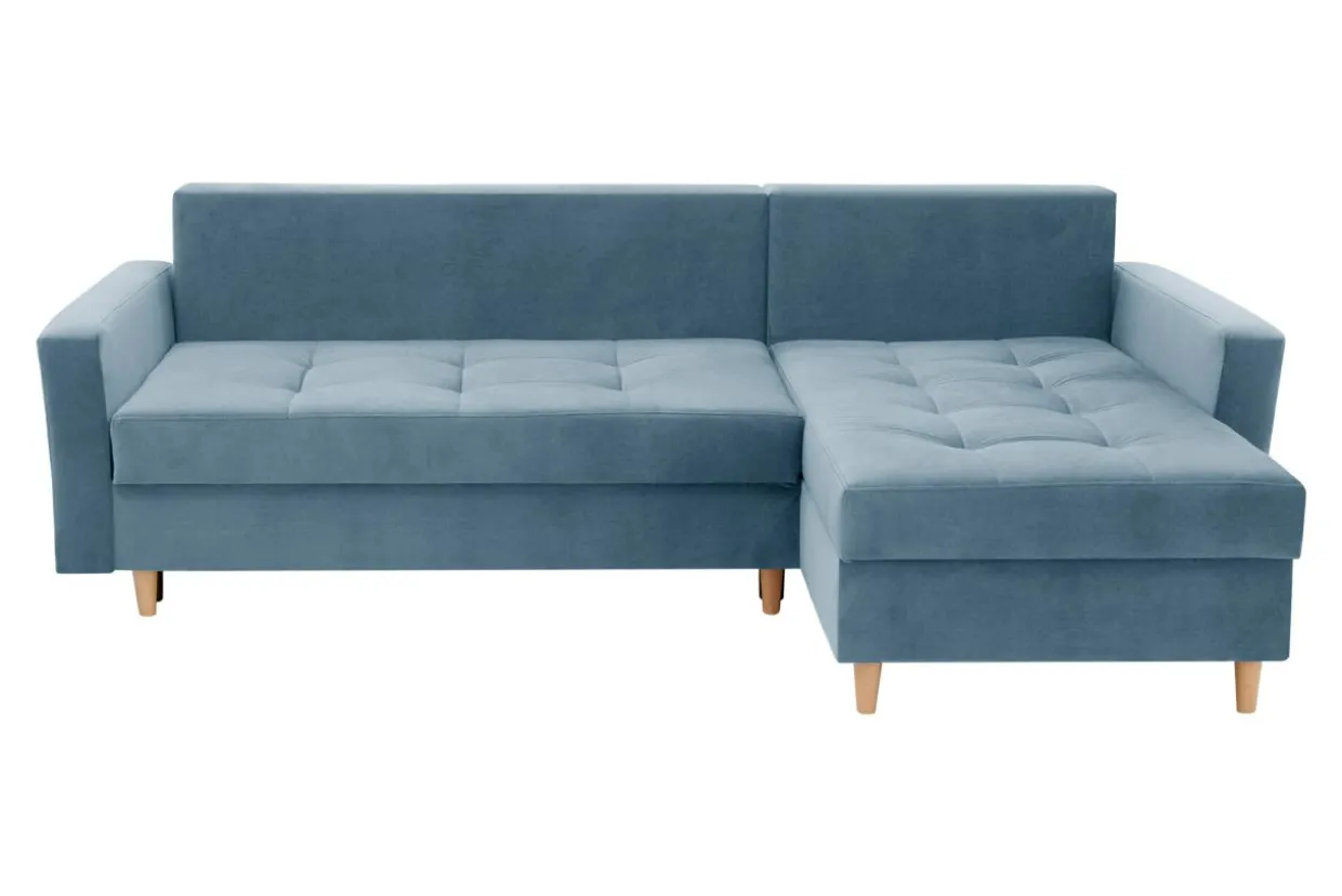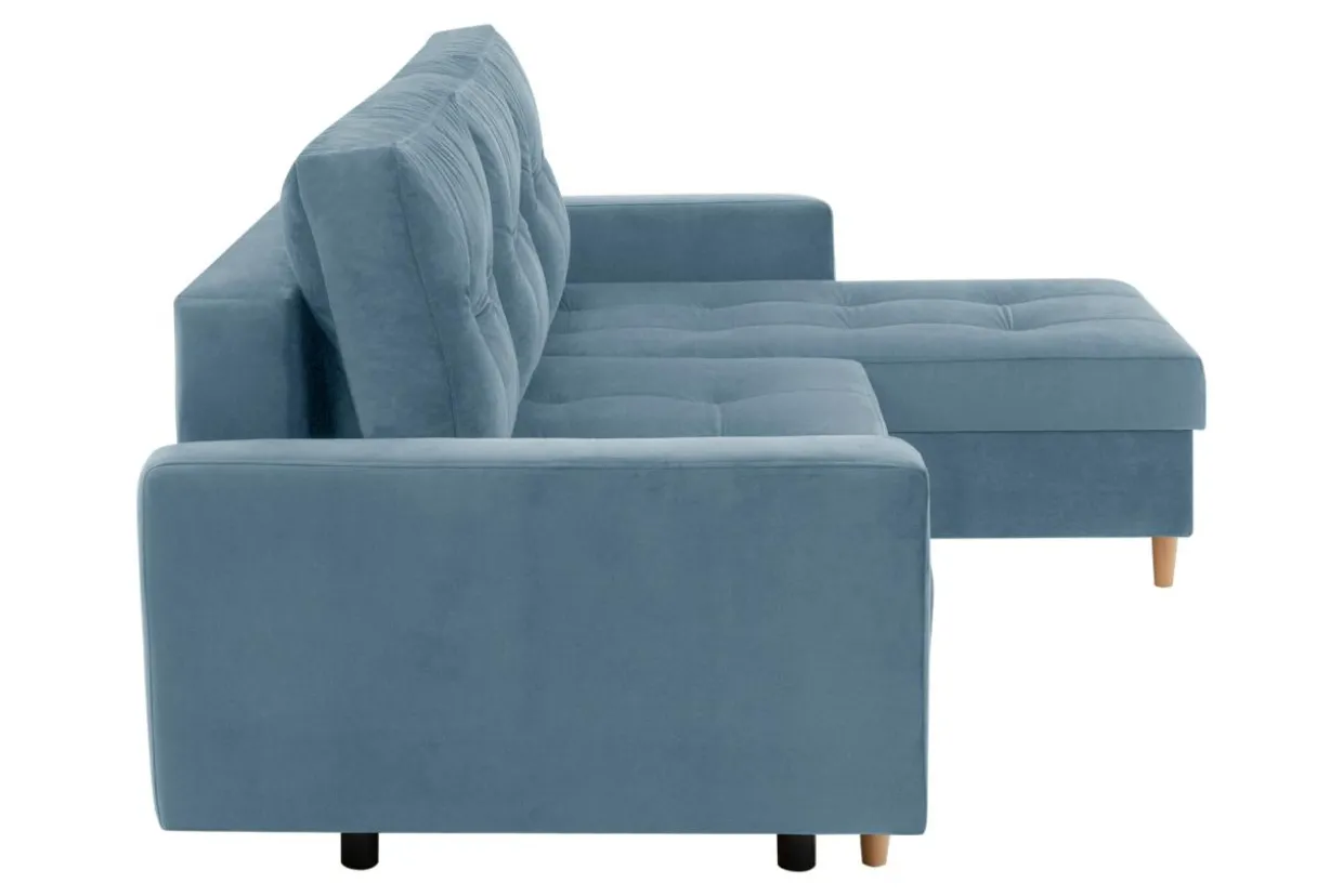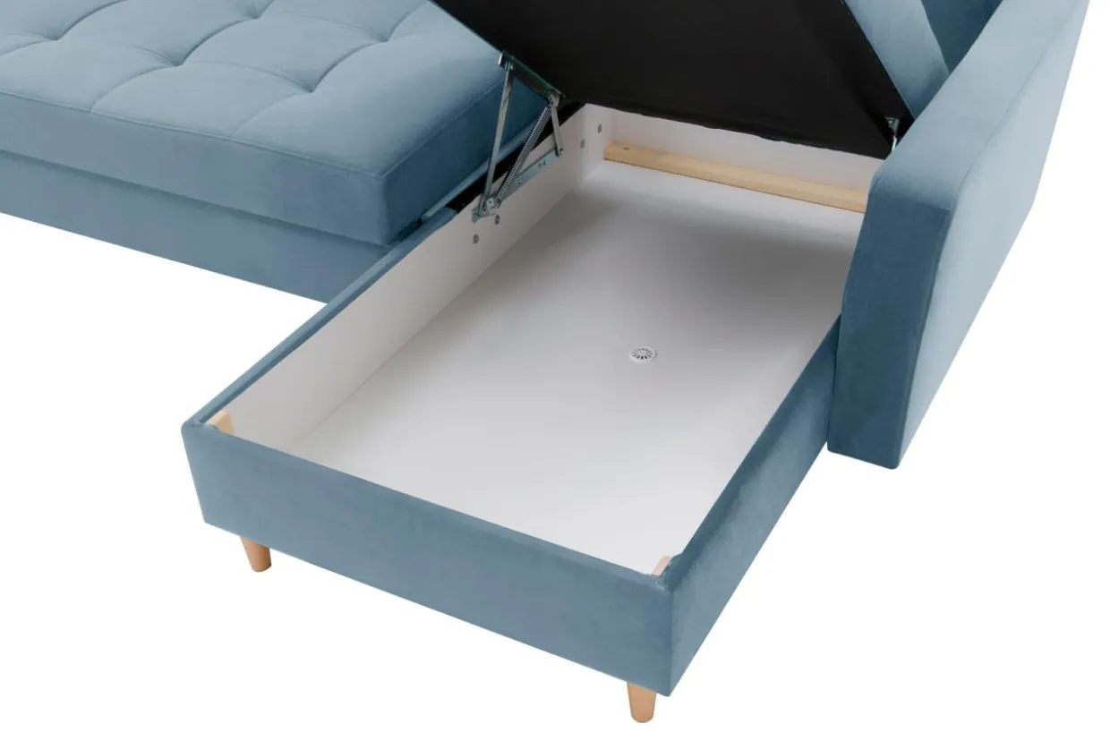 - Odcień niebieski i drewniane nóżki sprawiają, że narożnik stworzy w Twoim salonie klimat nadmorskich wakacji.