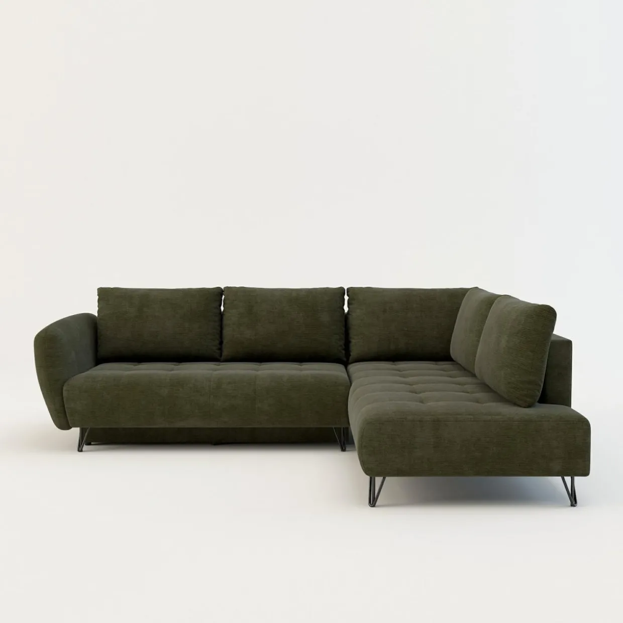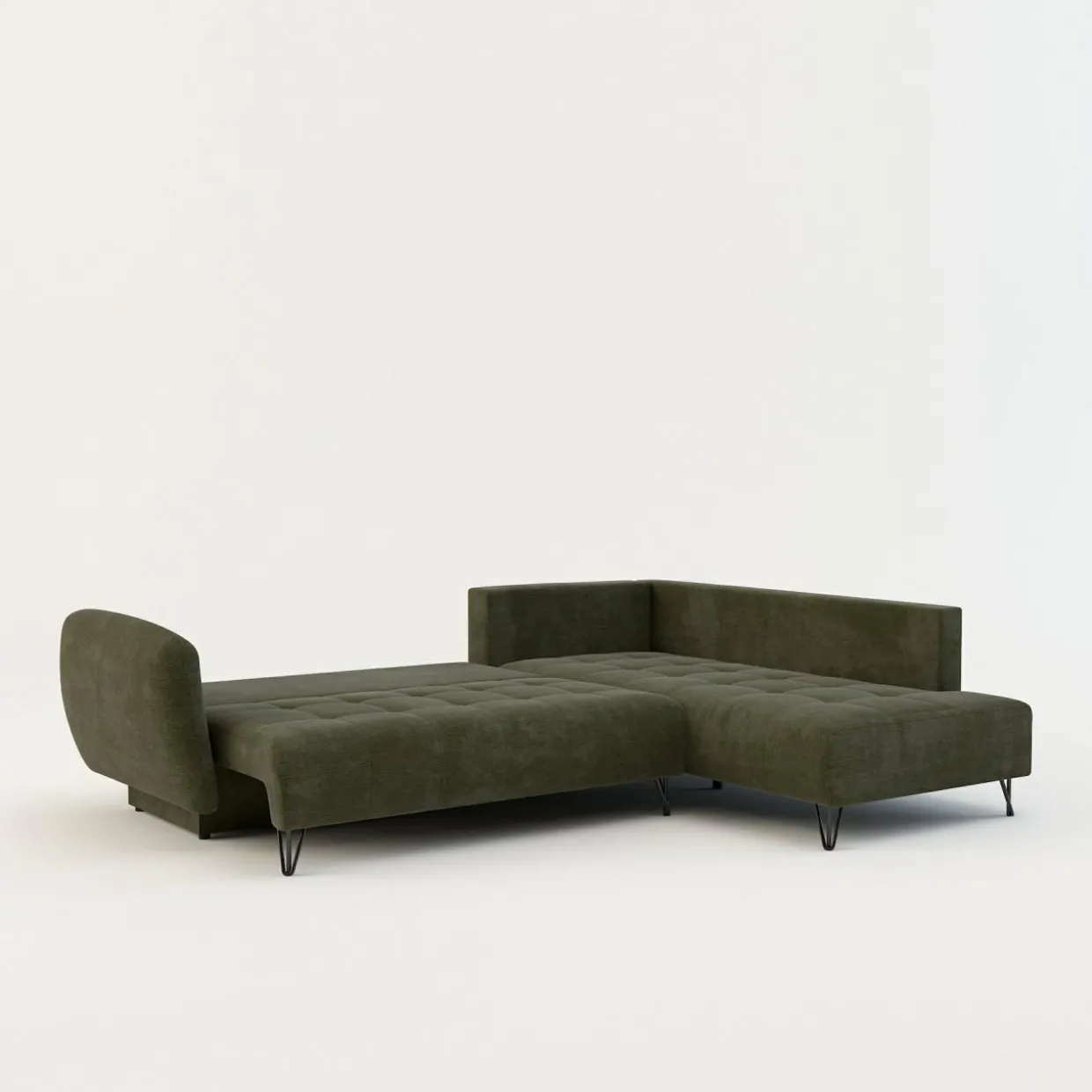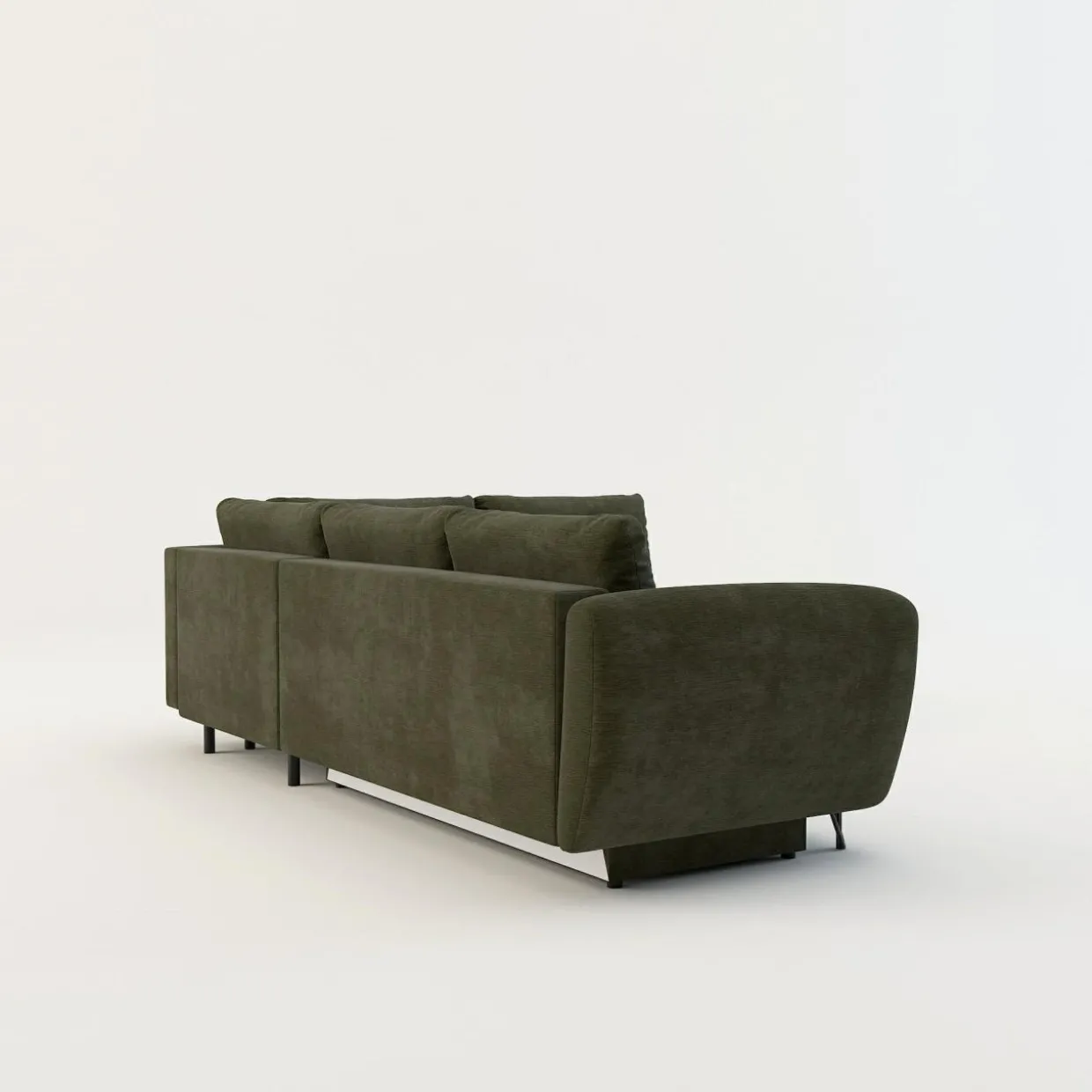 - Oliwkowa tkanina i czarne nóżki będą pasować zarówno do surowego, industrialnego wnętrza, jak i pełnej zieleni przestrzeni w stylu urban jungle.