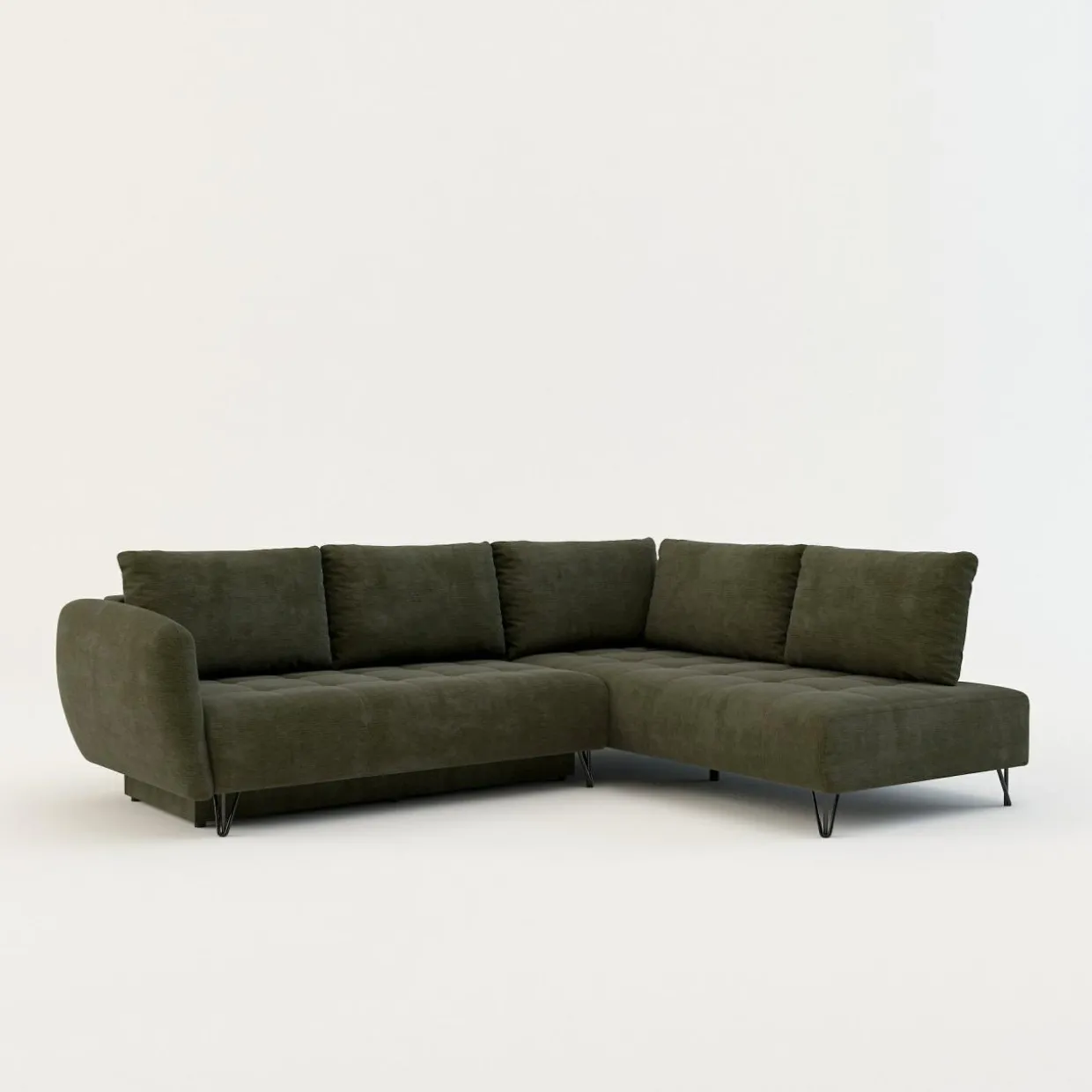 - W pojemniku pod siedziskiem wygodnie przechowasz pościel, koce lub inne domowe tekstylia. Dostęp do niego uzyskasz podczas rozkładania narożnika.