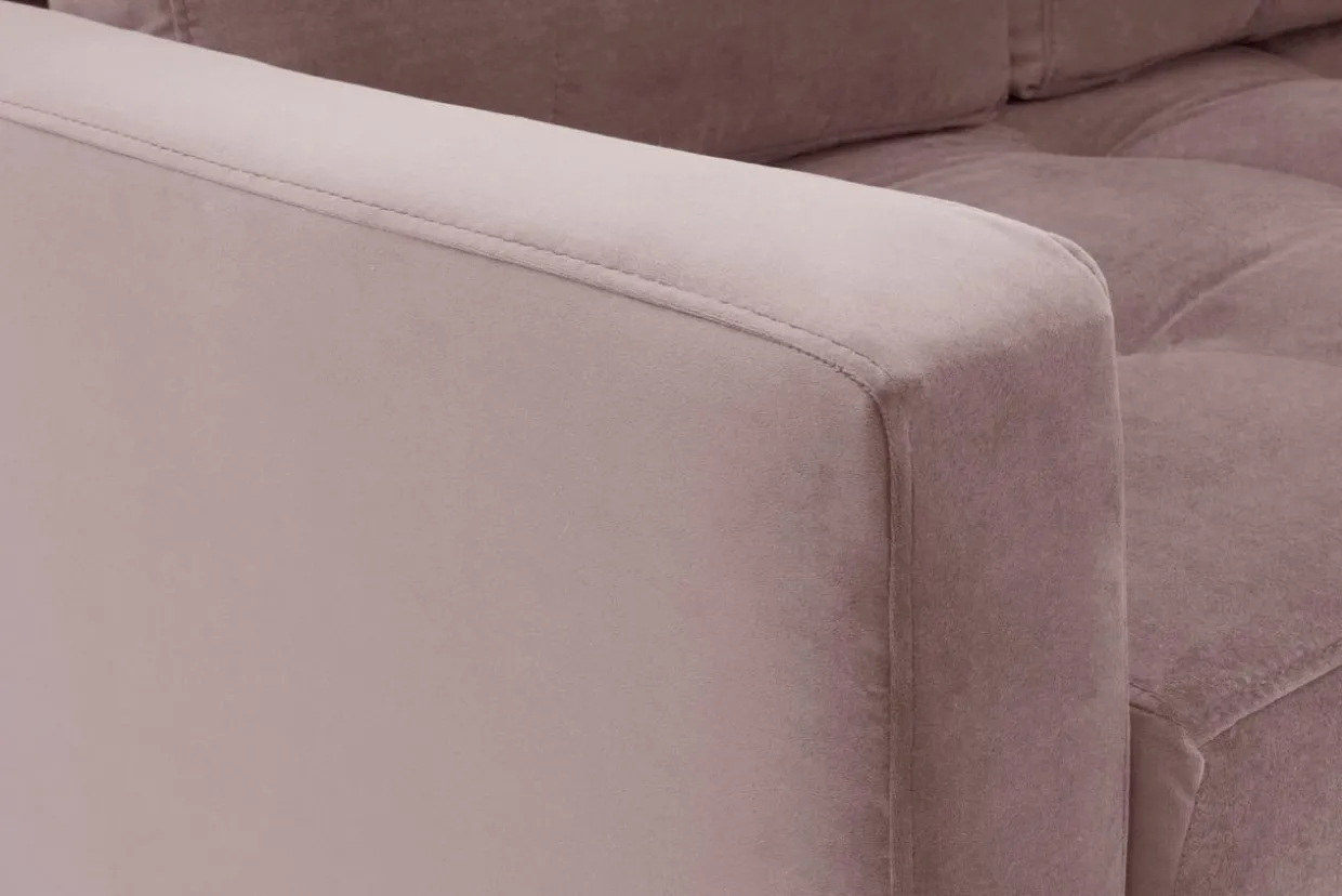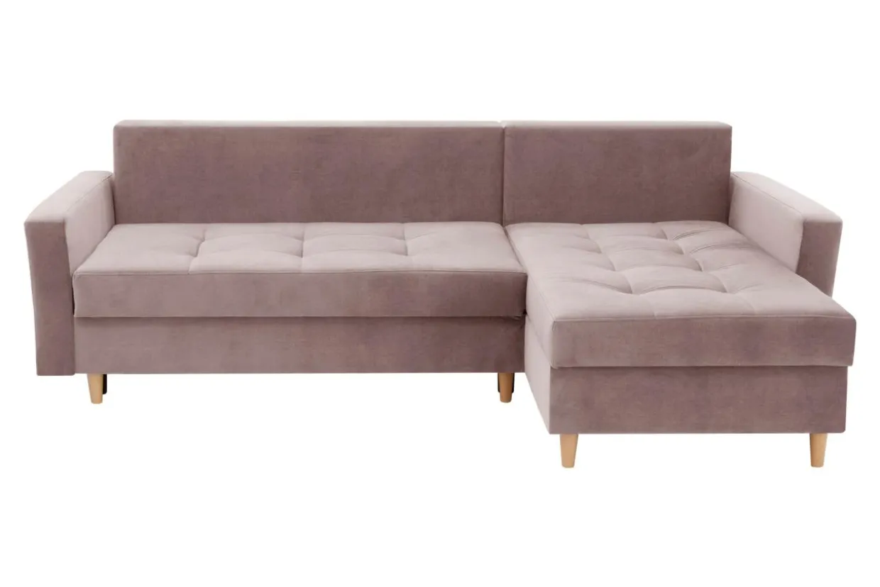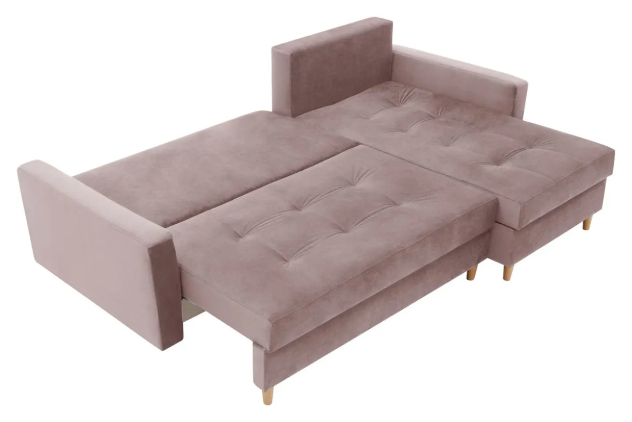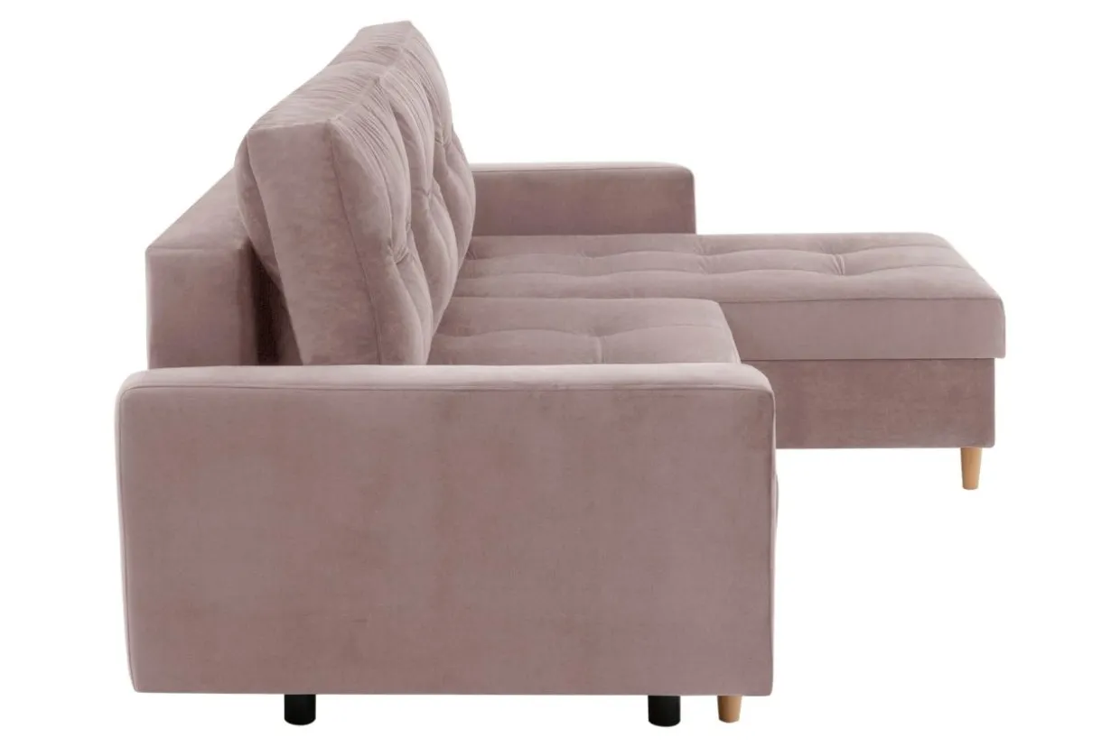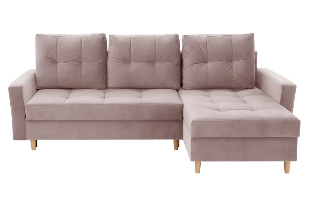 - Odcień brudnego różu i drewniane nóżki sprawiają, że narożnik pięknie będzie pasował do nowoczesnego, kobiecego salonu.
