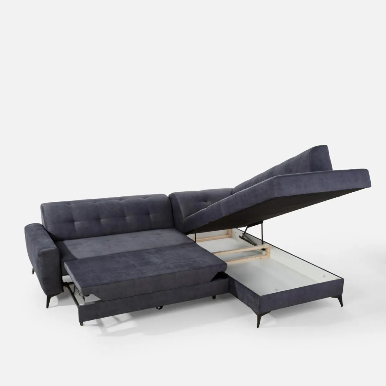 Stelaż pod siedziskiem wysuwamy i podnosimy za pomocą uchwytu. Mebel nie wymaga odsuwania od ściany. Idealny do okazjonalnego spania.