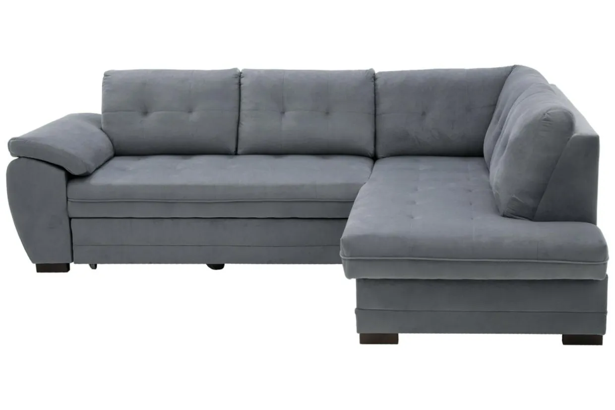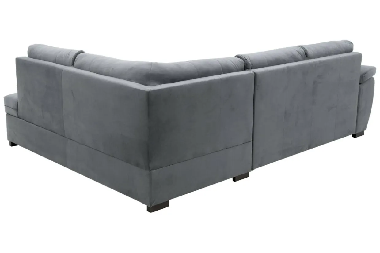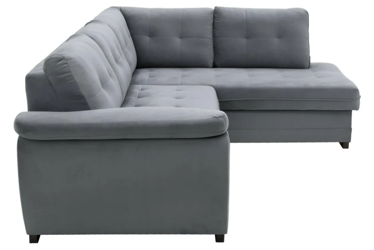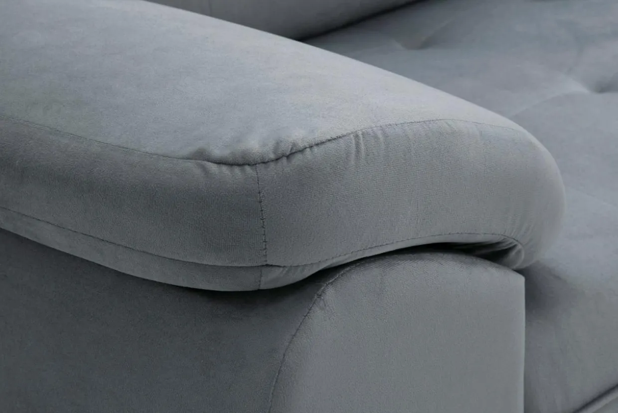 Narożnik pokryty jest miękką, bardzo miłą w dotyku welurową tkaniną w szarym kolorze. Ozdobne pikowanie podkreśla walory estetyczne mebla.