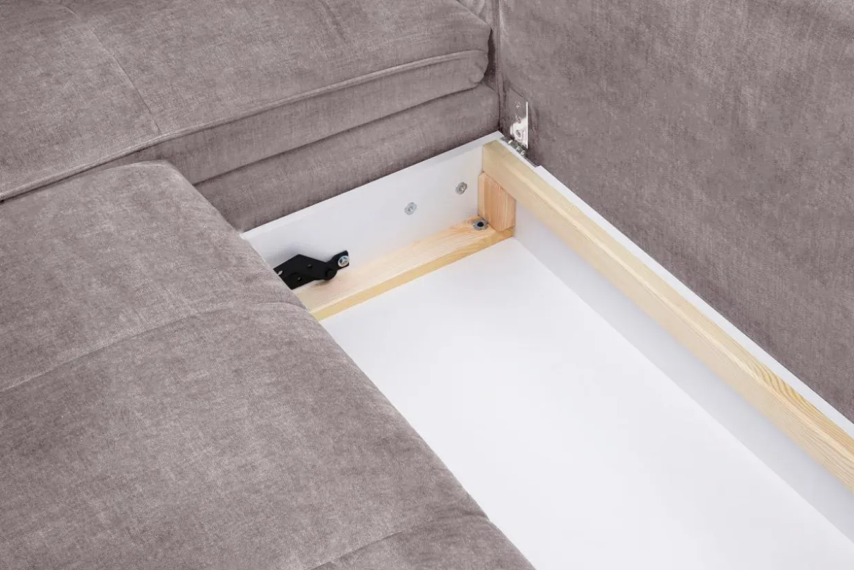 - Narożnik został obity welwetową tkaniną VOGUE w kolorze taupe.