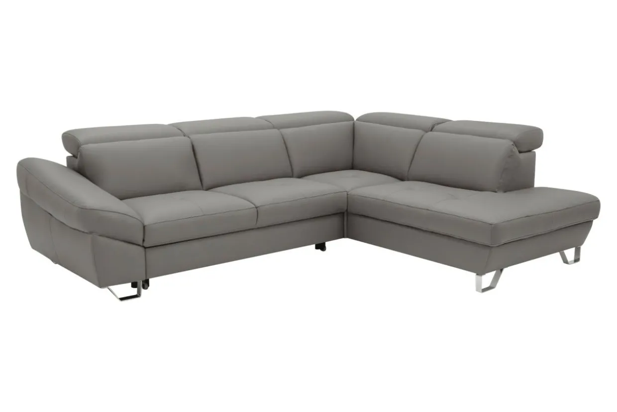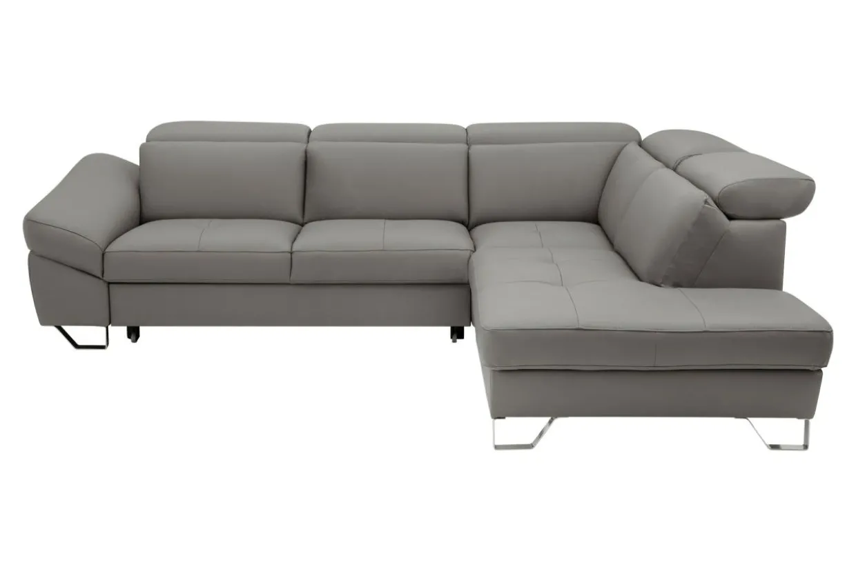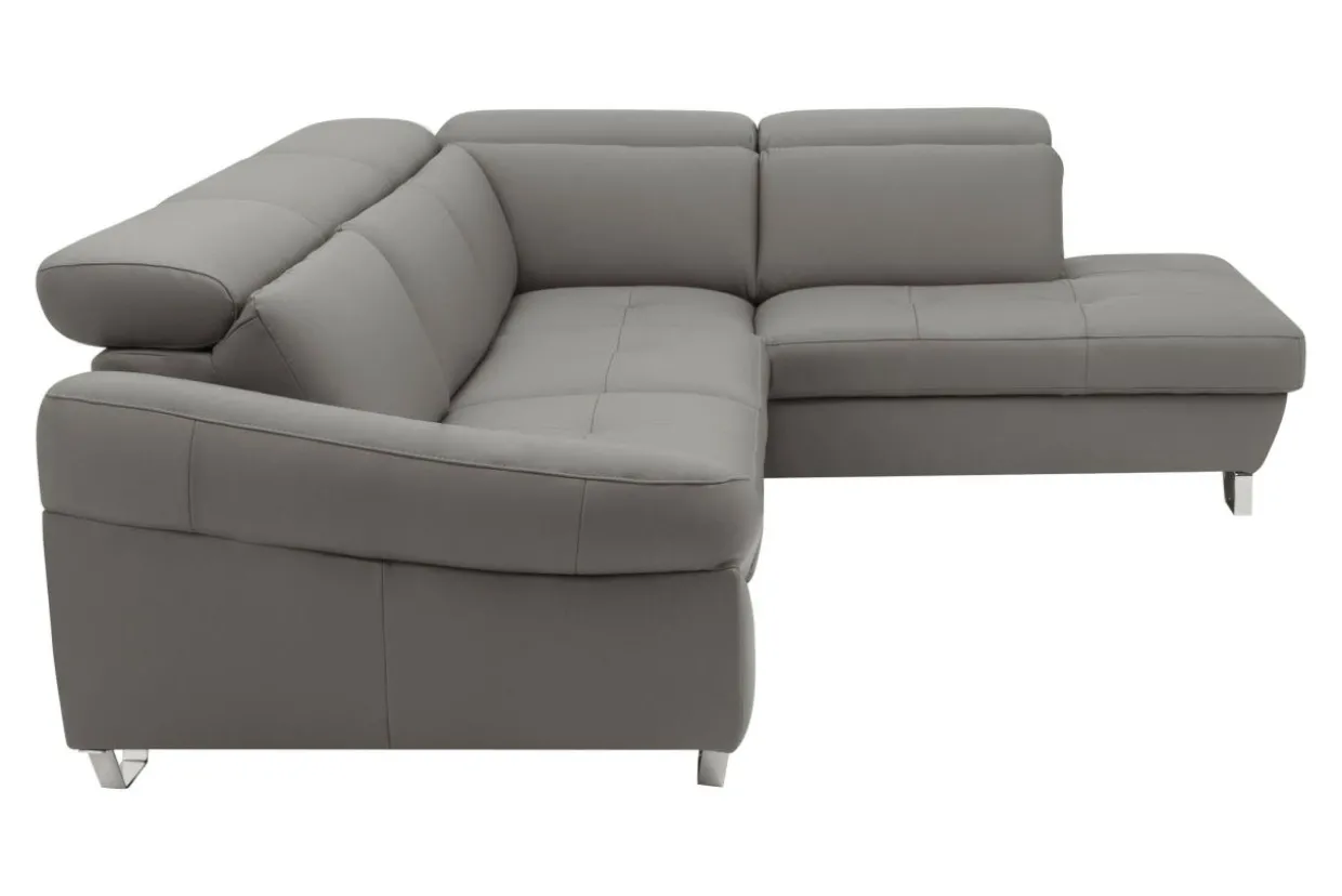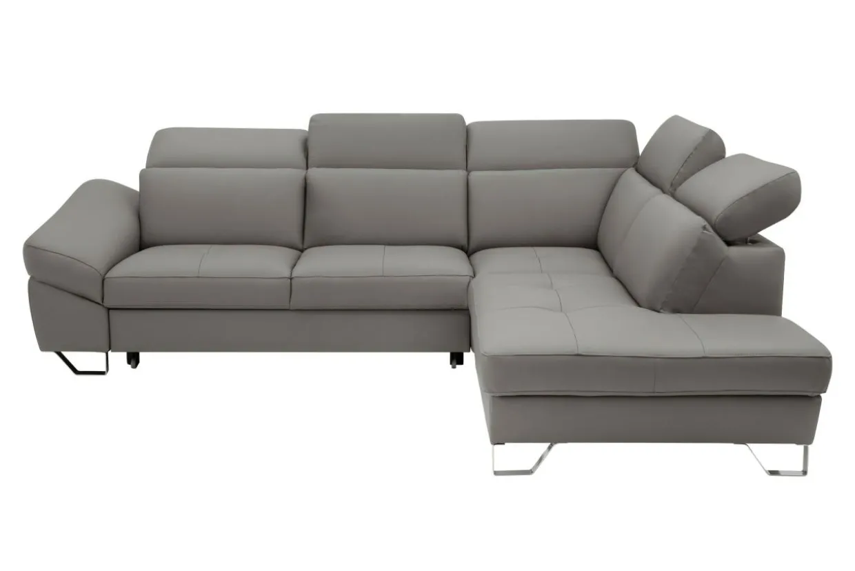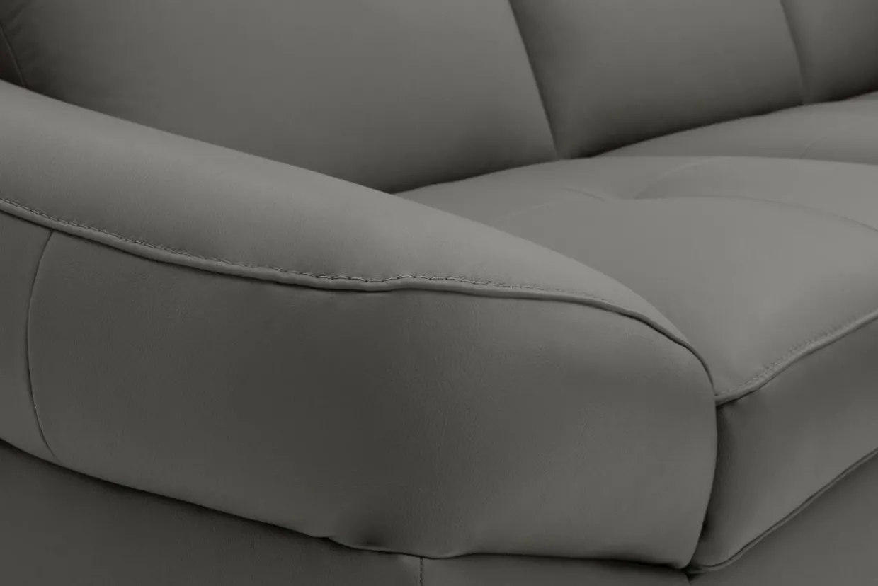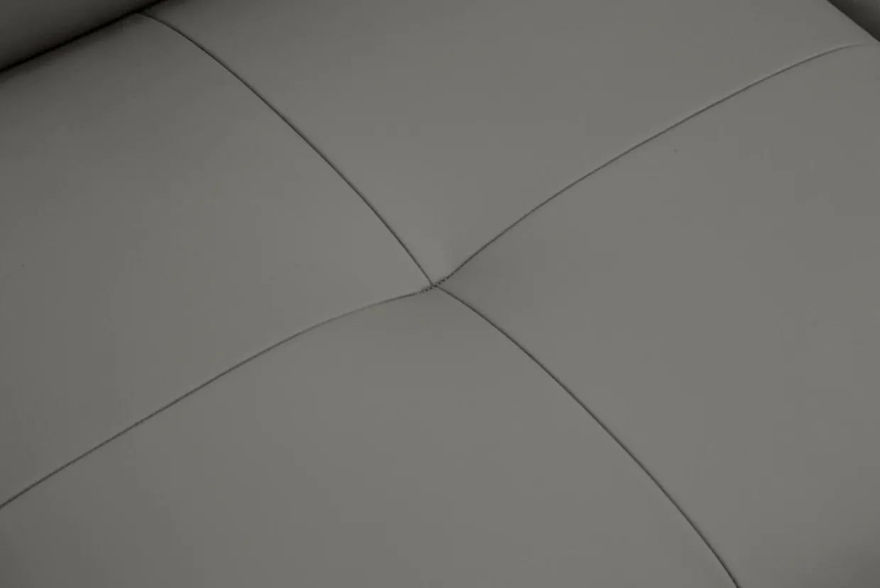 Dzięki wyrazistym przeszyciom i metalowym nóżkom narożnik DRUM jest niezwykle efektowny. Elegancji dodaje mu obicie wykonane z wysokiej jakości skóry naturalnej w stonowanym szarym kolorze.