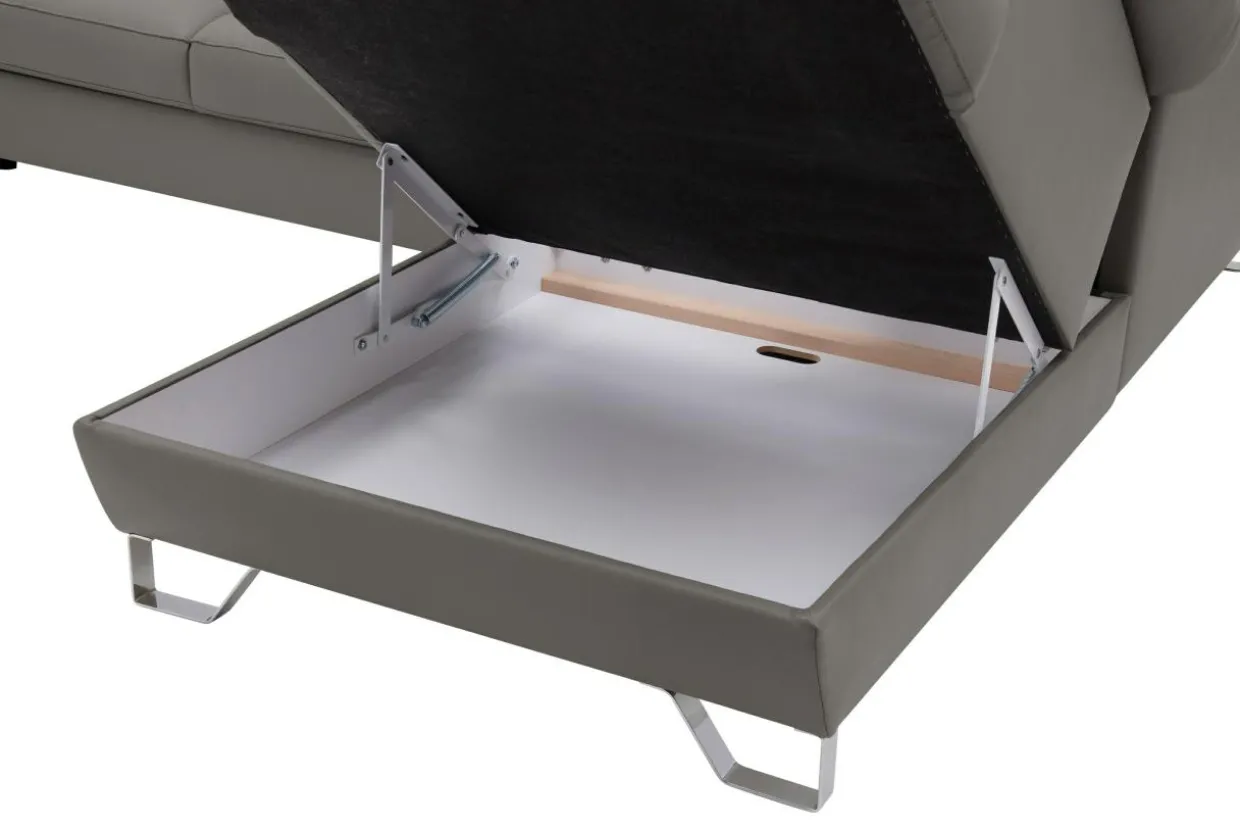 Narożnik posiada wbudowany pojemnik. Możesz wykorzystać go do przechowywania pościeli, koców lub innych tekstyliów. Pojemnik znajduje się w otomanie.
