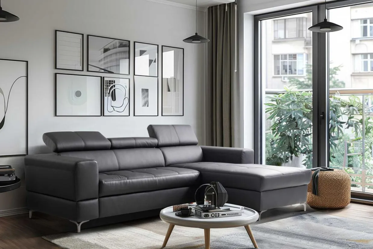 Narożnik posiada wyraziste przeszycia, które dodają mu elegancji.