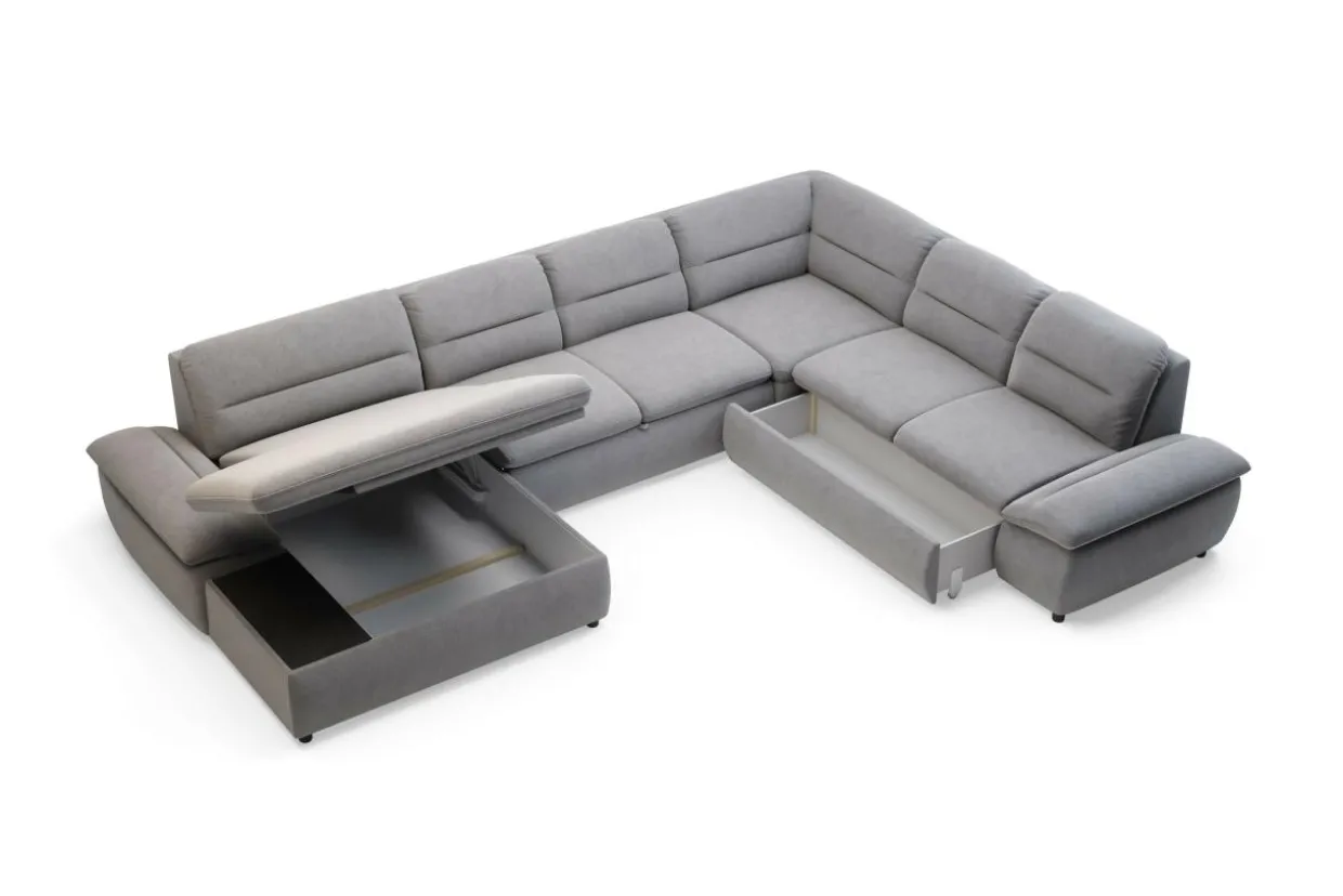 Jeden poręczny schowek znajduje się w otomanie narożnika, drugi w wysuwanej spod siedziska szufladzie.