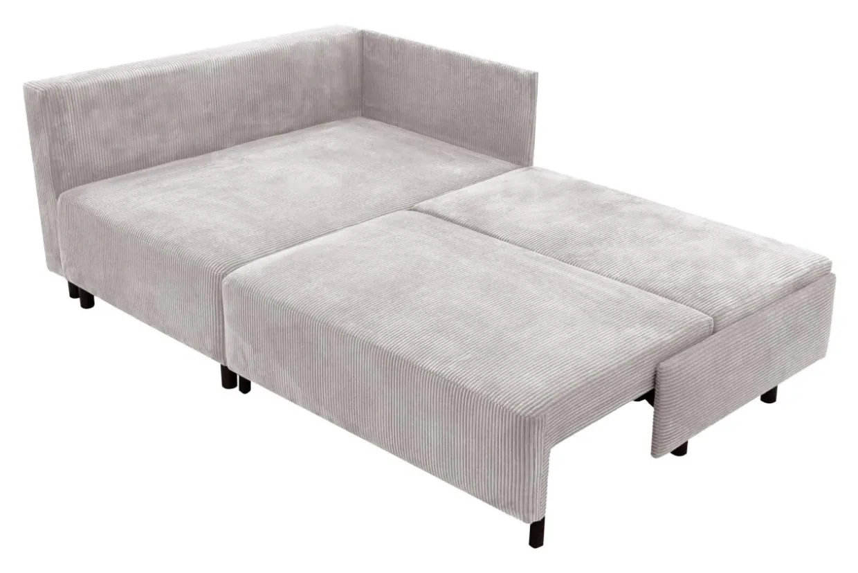 Narożnik w jasnoszarym kolorze przyciąga wzrok miękką, sztruksową tapicerką.