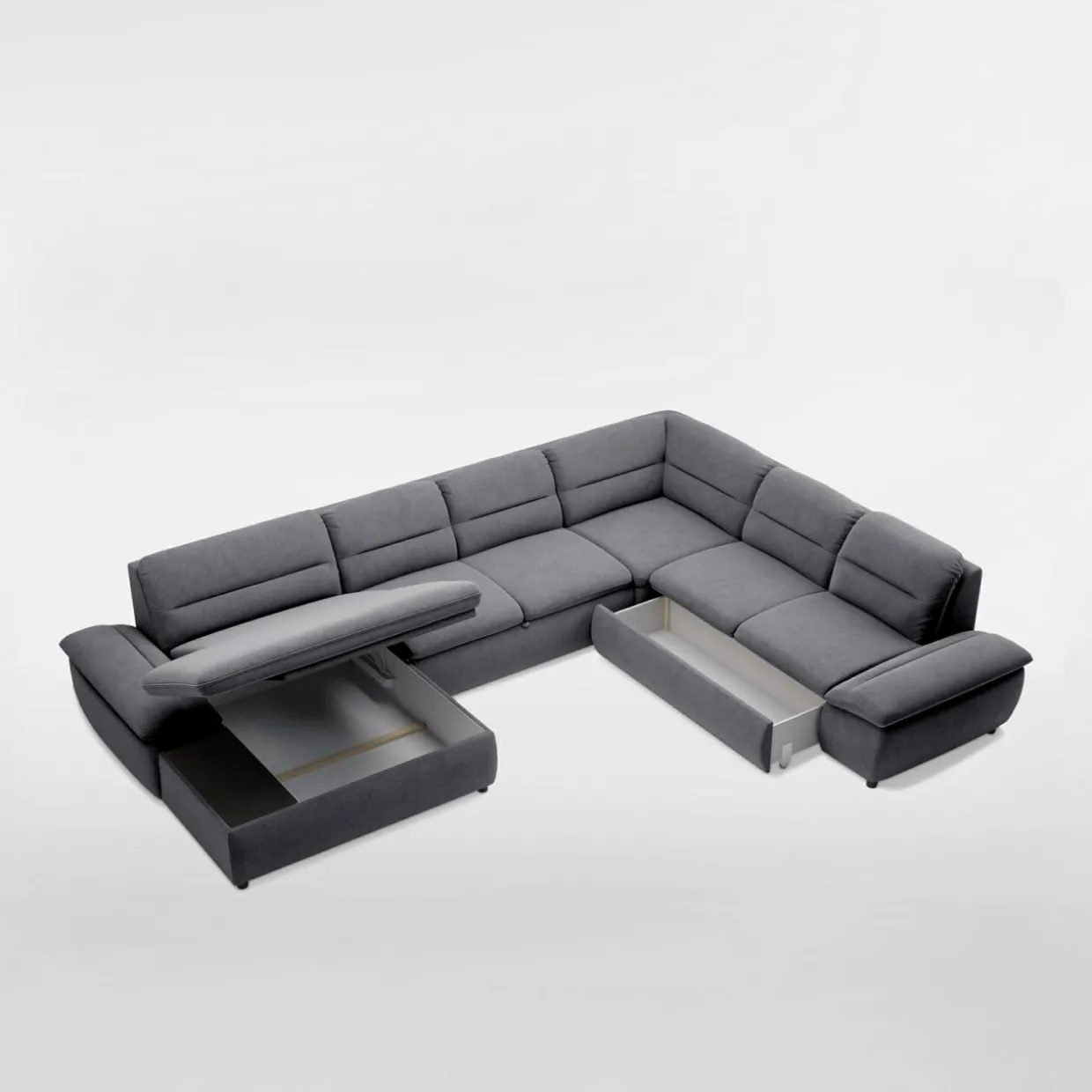 - Narożnik można rozłożyć, ma 2 pojemniki na pościel oraz ruchomy podłokietnik.