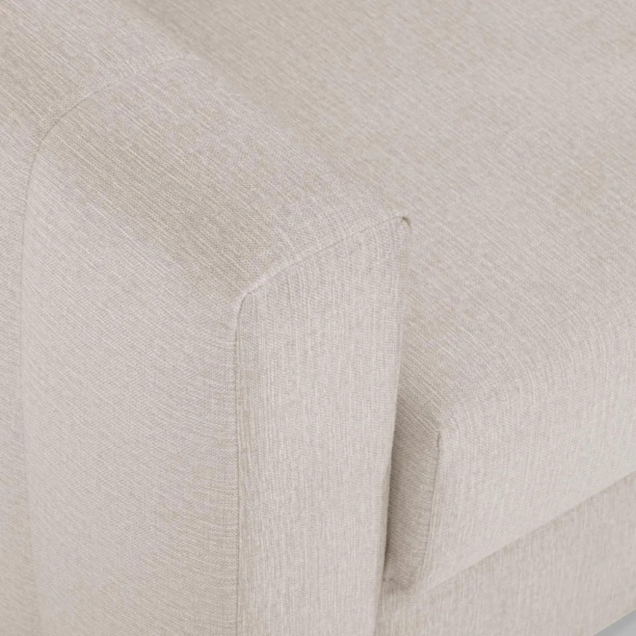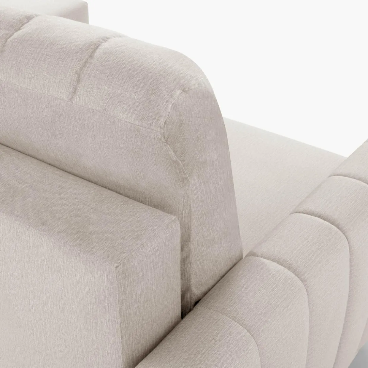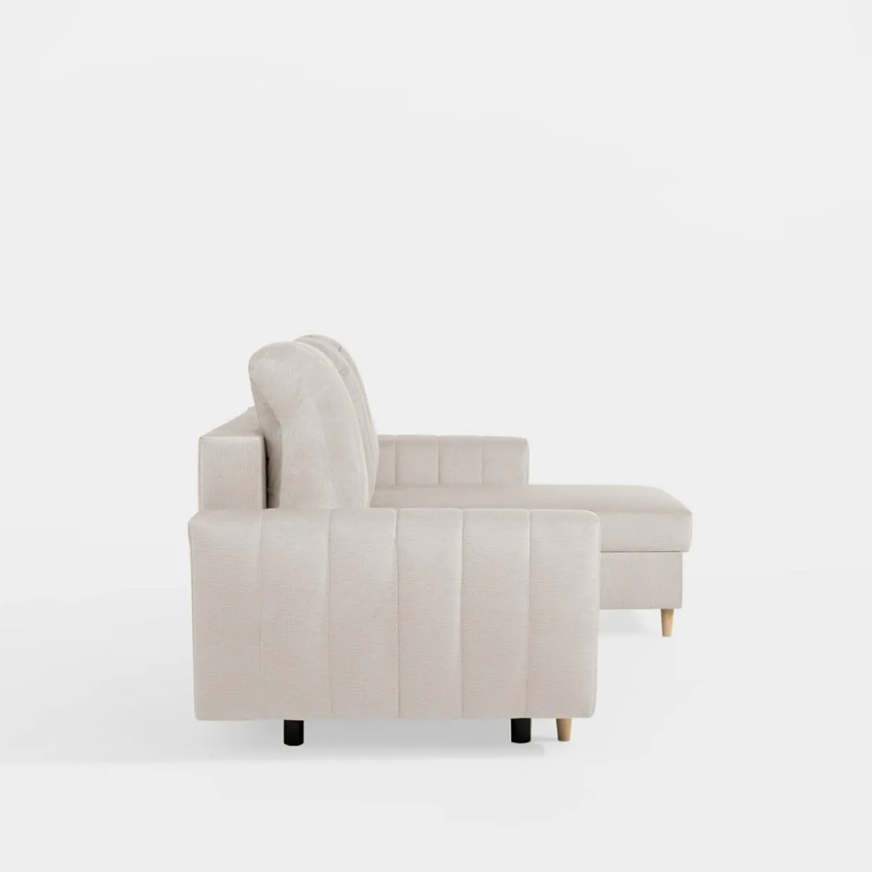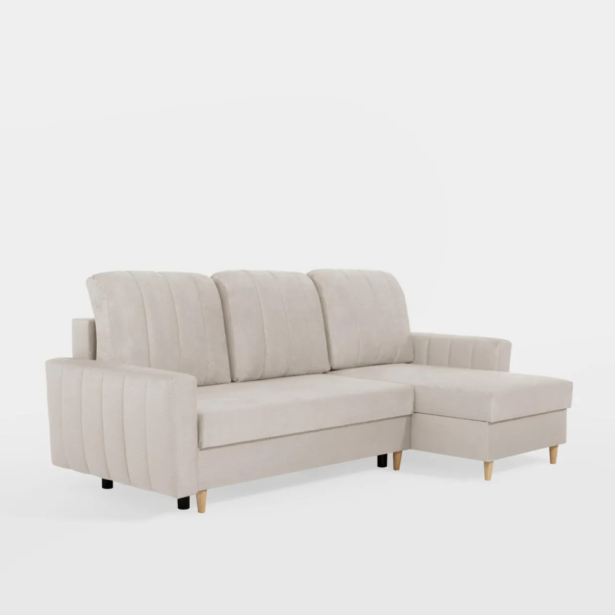 Narożnik MASIMO pokryto tkaniną w drobną, beżową plecionkę. Przyjemny w dotyku materiał będzie, który umili popołudniowy wypoczynek w salonie.