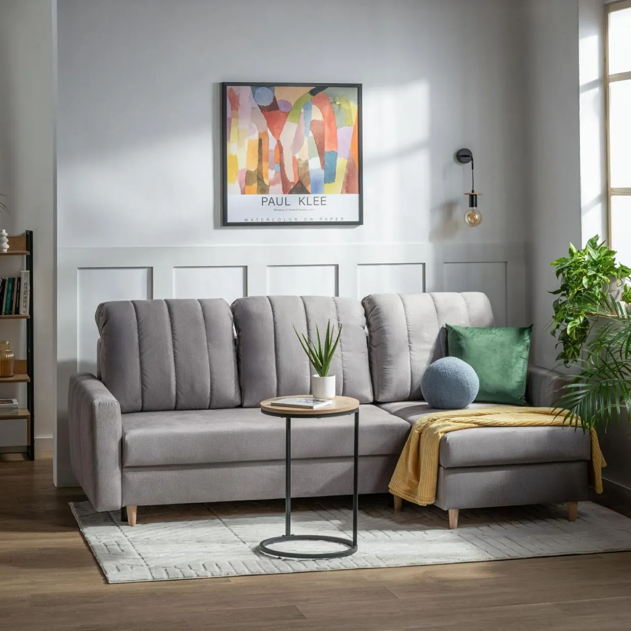 Narożnik MASIMO pokryto tkaniną w drobną, szarą plecionkę. Przyjemny w dotyku materiał, umili popołudniowy wypoczynek w salonie.
