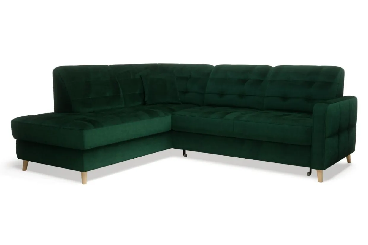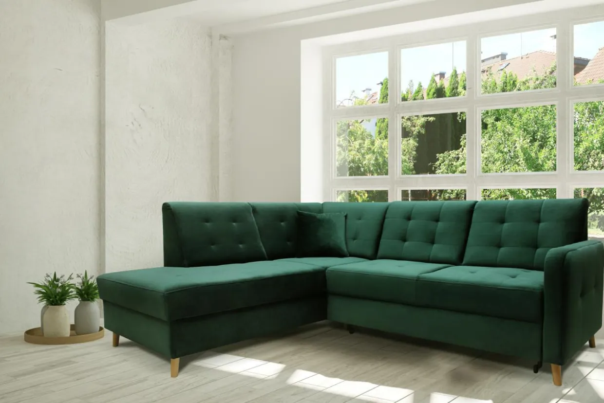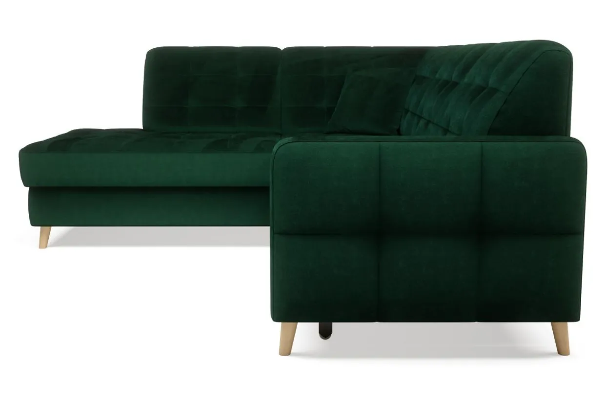 Welurowa tkanina RIVIERA użyta do obicia mebla jest bardzo przyjemna w dotyku i mało podatna na ścieranie. Wysokie nóżki wykonane są z bukowego drewna zabezpieczonego lakierem.