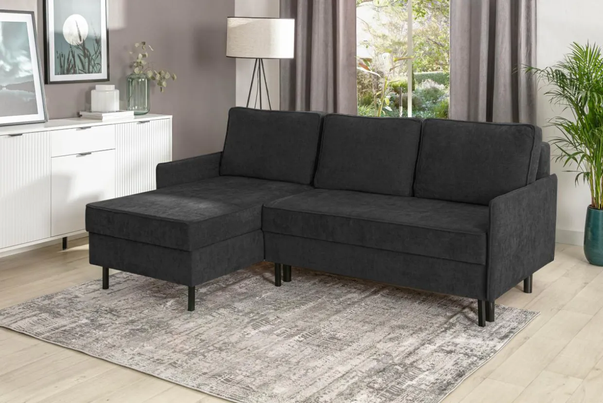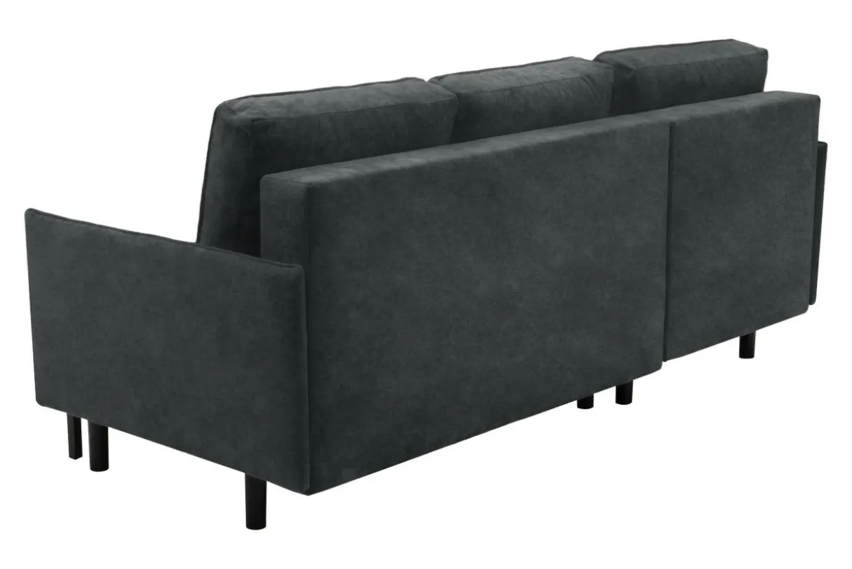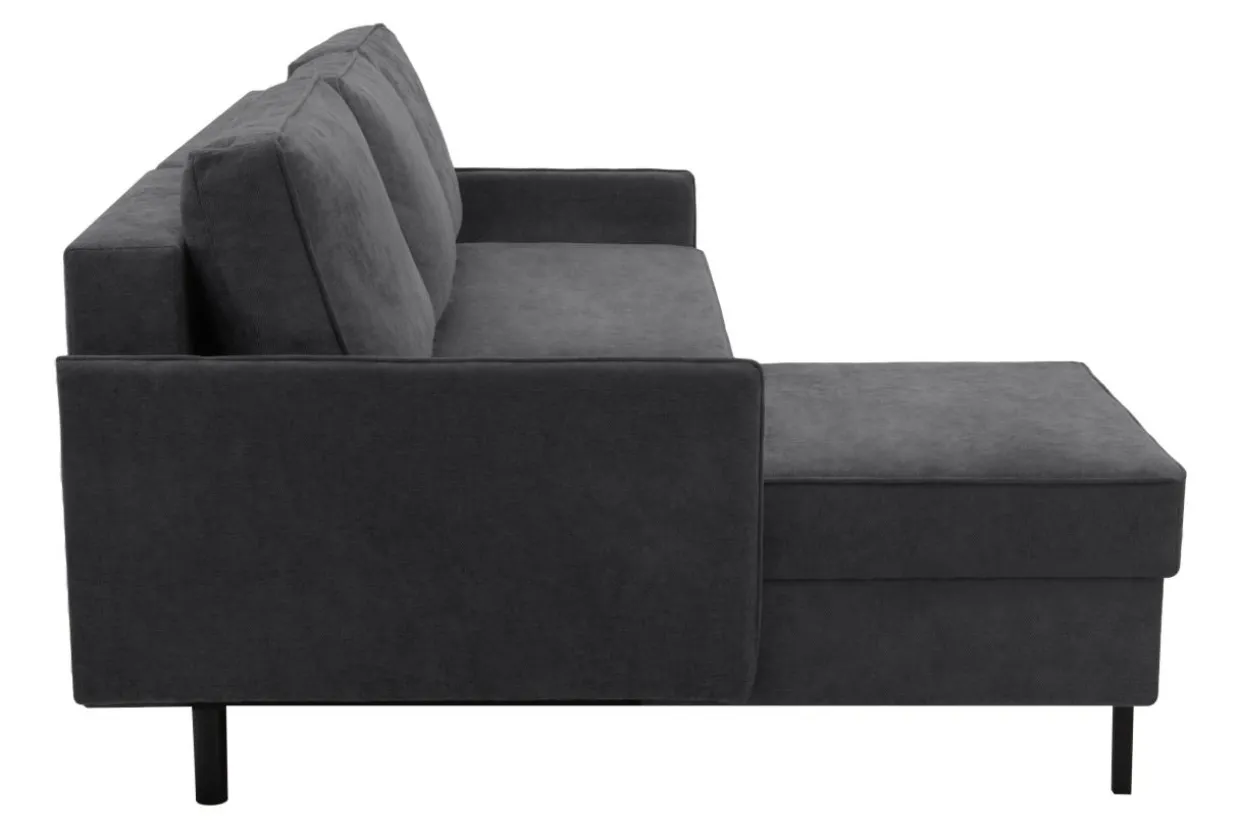 - Ciemnoszary kolor i metalowe, czarne nóżki sprawiają, że narożnik dobrze zaprezentuje się w loftowej aranżacji w otoczeniu drewna o ciepłym odcieniu i czarnych dodatków.
