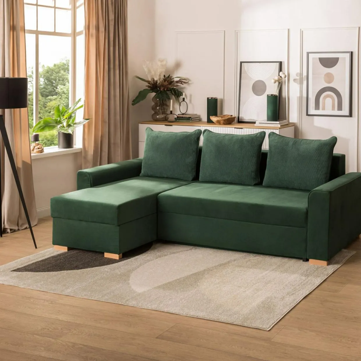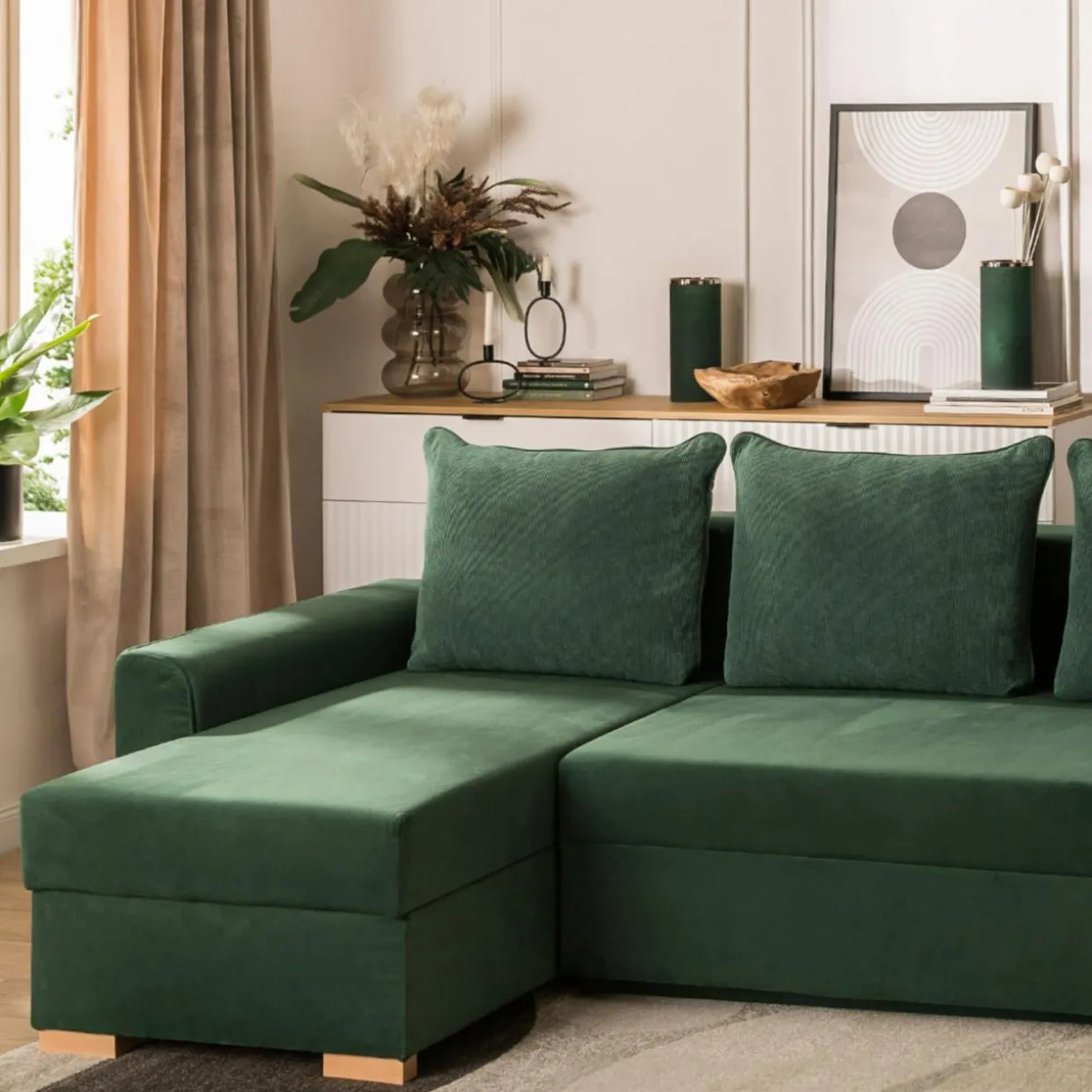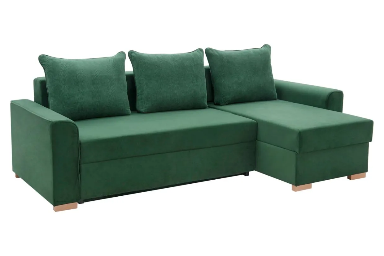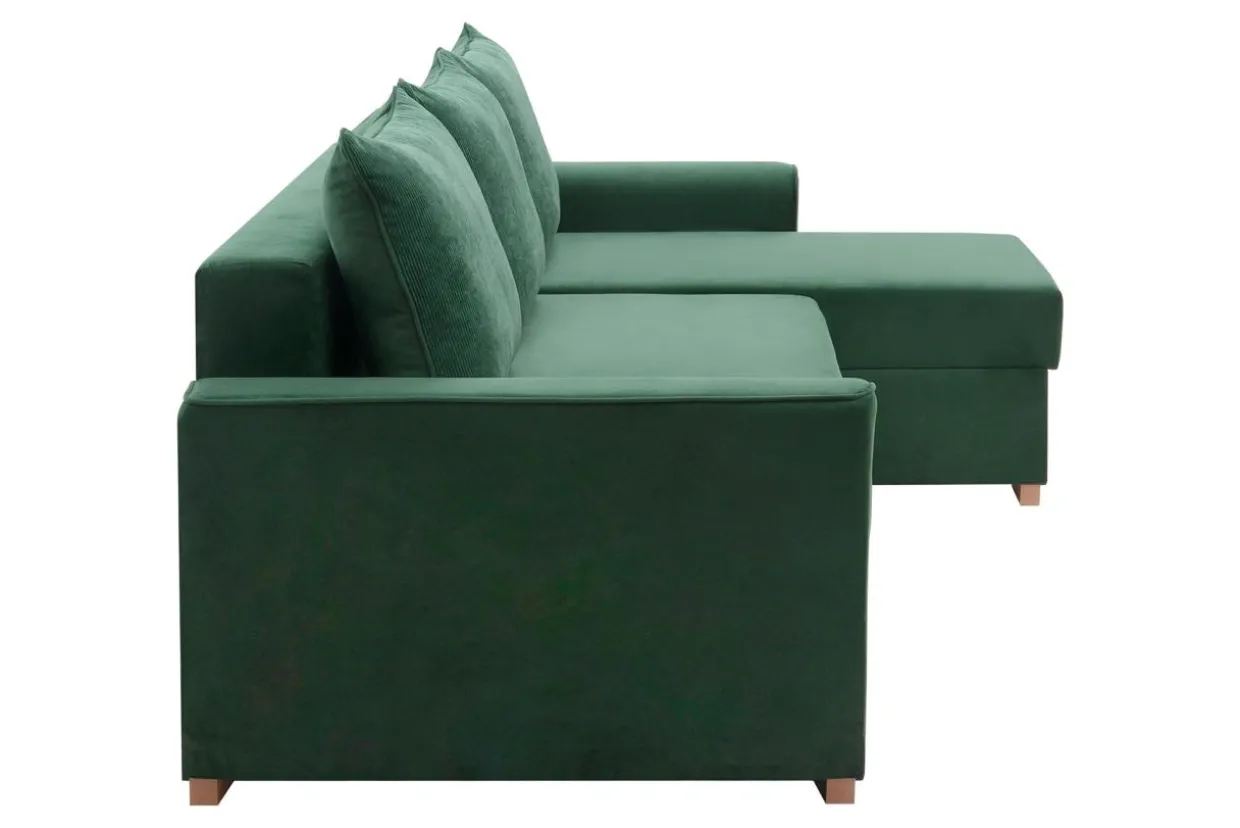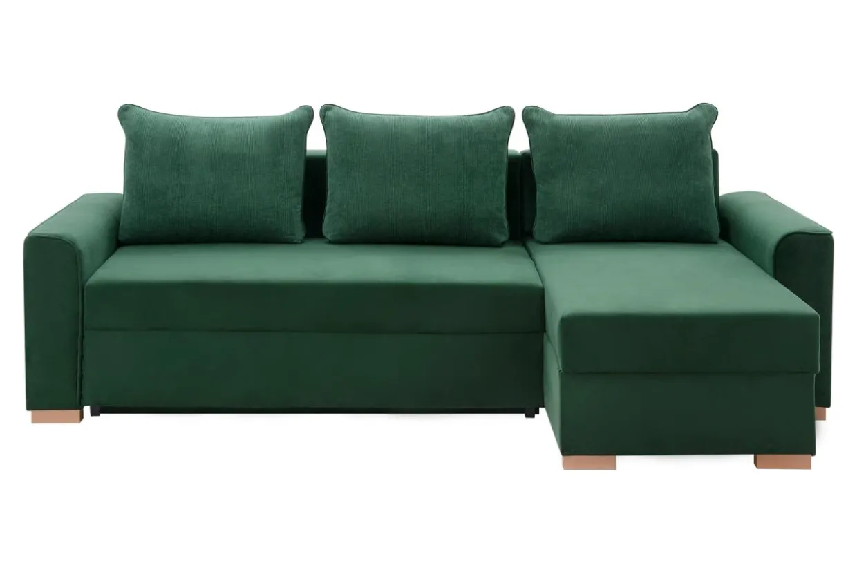 - Tkanina MANILA to gładki, miły welur. Butelkowozielony kolor i drewniane nóżki sprawiają, że narożnik pięknie zaprezentuje się w pomieszczeniach urządzonych w stylu urban jungle.