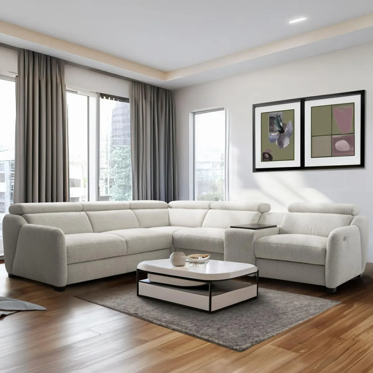 - Narożnik wyposażony jest w fotel z elektryczną funkcją relaks, która pozwala rozsiąść się wygodnie w pozycji półleżącej — idealnej do oglądania filmów, czytania książek lub po prostu relaksu.