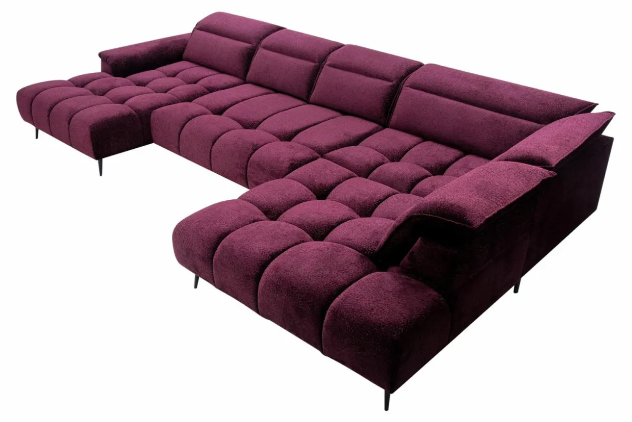 Narożnik w kształcie litery U postawiony jest na wysokich, lekko ukośnych nóżkach. Dzięki temu bryła, mimo pokaźnych rozmiarów, nabiera lekkości.