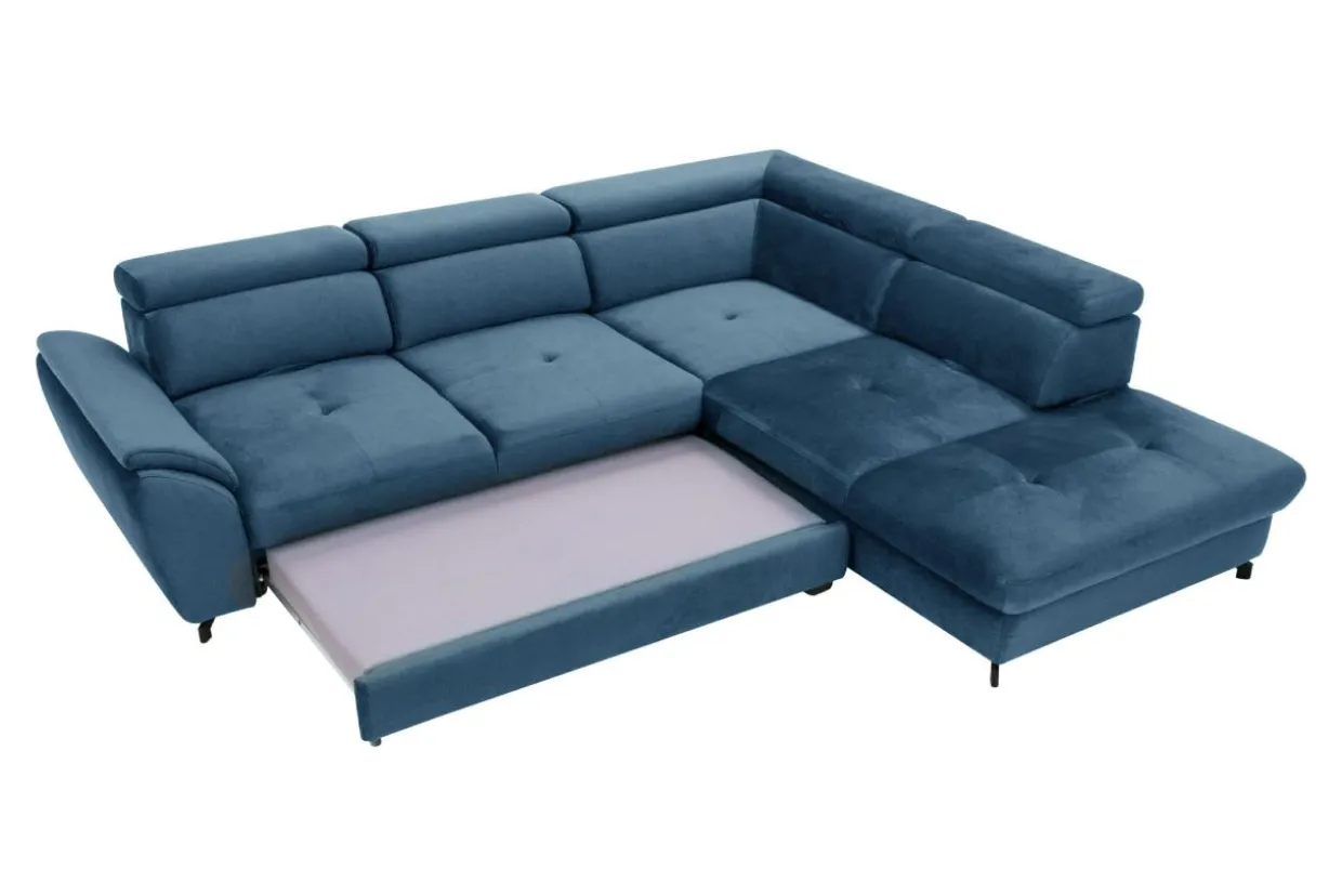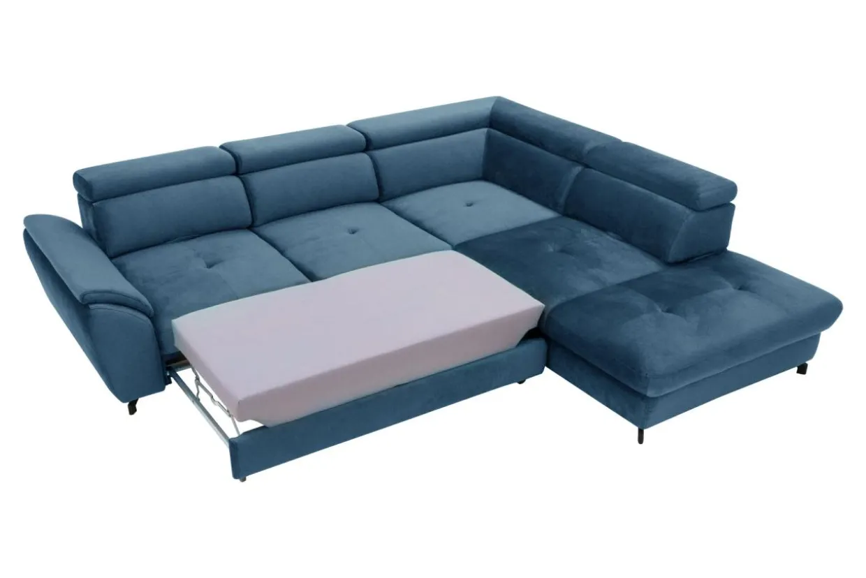 - Główna zaleta: narożnik może swobodnie stać przy ścianie, dlatego że rozkładanie nie wymaga odsuwania go.
